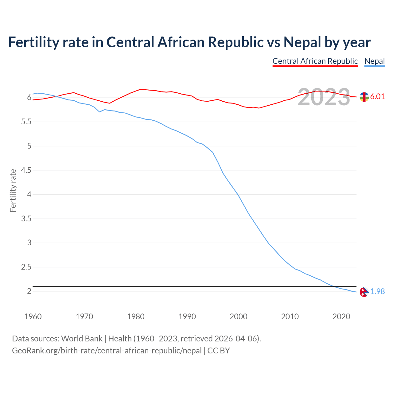 1960 vs 2023, the fertility rate has changed by +1.08% in the Central African Republic and by 67.3% in Nepal — in 1960, it was 5.95 and 6.07, respectively.