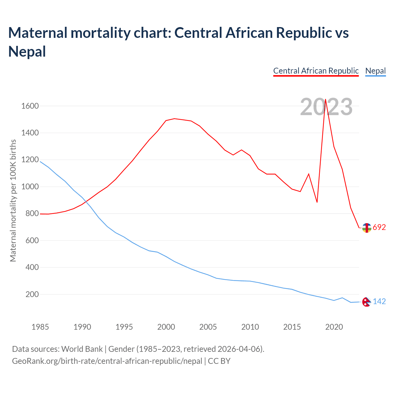 The maternal mortality rate, which is the probability of dying during childbirth or within 42 days of pregnancy termination, is 692 deaths per 100,000 live births in the Central African Republic, compared to 142 deaths in Nepal.