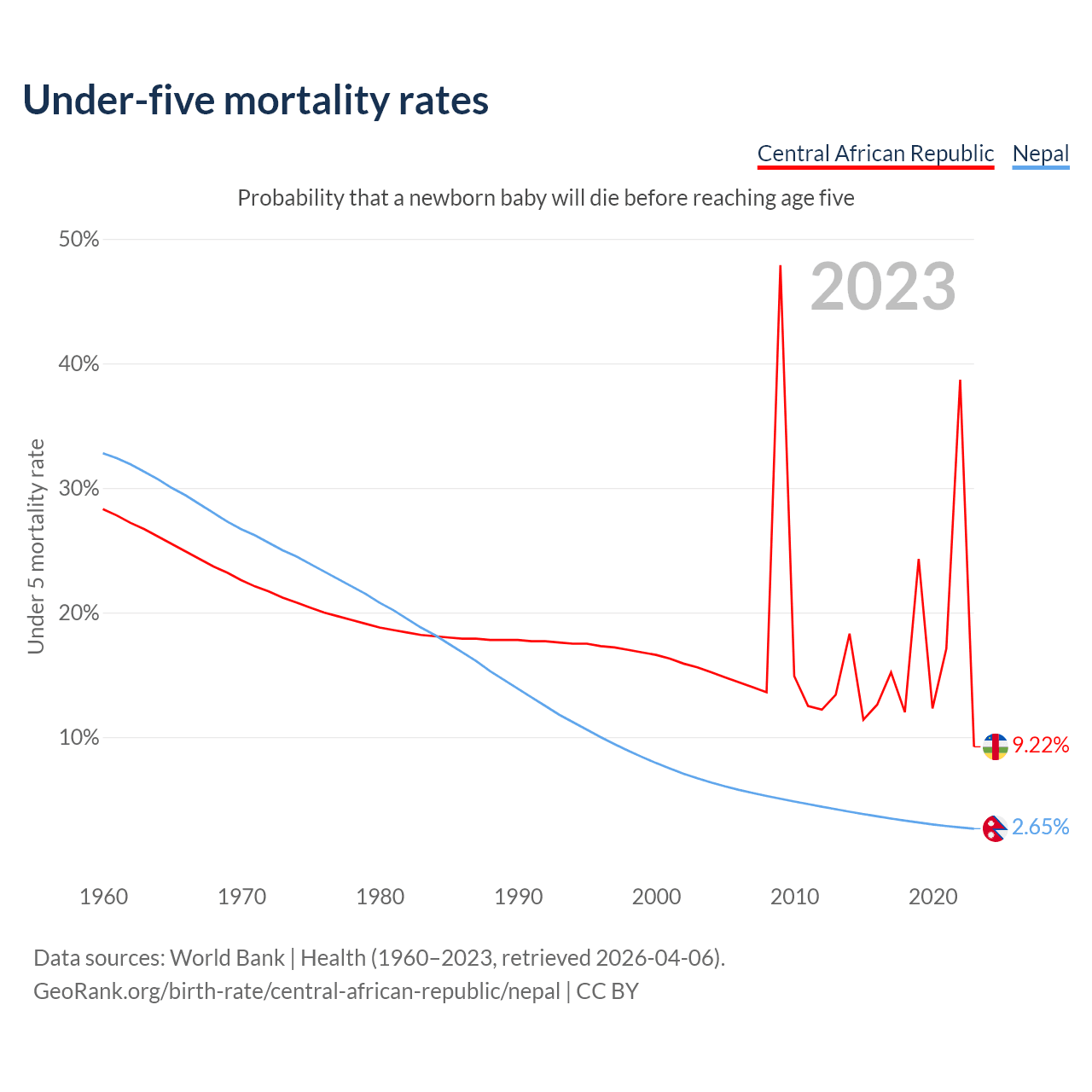 The chance that a newborn baby will die before reaching age five is 9.22% in the Central African Republic and 2.65% in Nepal. Above is a chart with historical data on under-five mortality rates.
