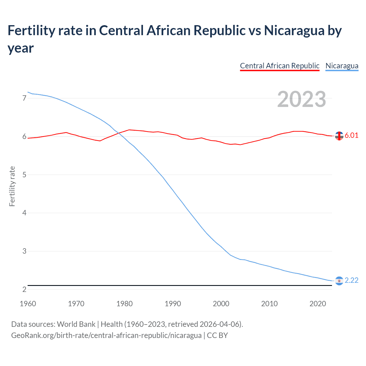 1960 vs 2023, the fertility rate has changed by +1.08% in the Central African Republic and by 69% in Nicaragua — in 1960, it was 5.95 and 7.16, respectively.