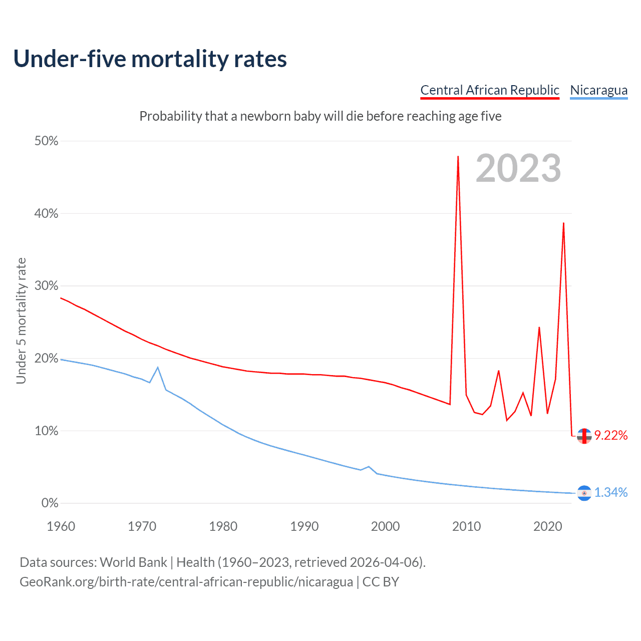 The chance that a newborn baby will die before reaching age five is 9.22% in the Central African Republic and 1.34% in Nicaragua. Above is a chart with historical data on under-five mortality rates.