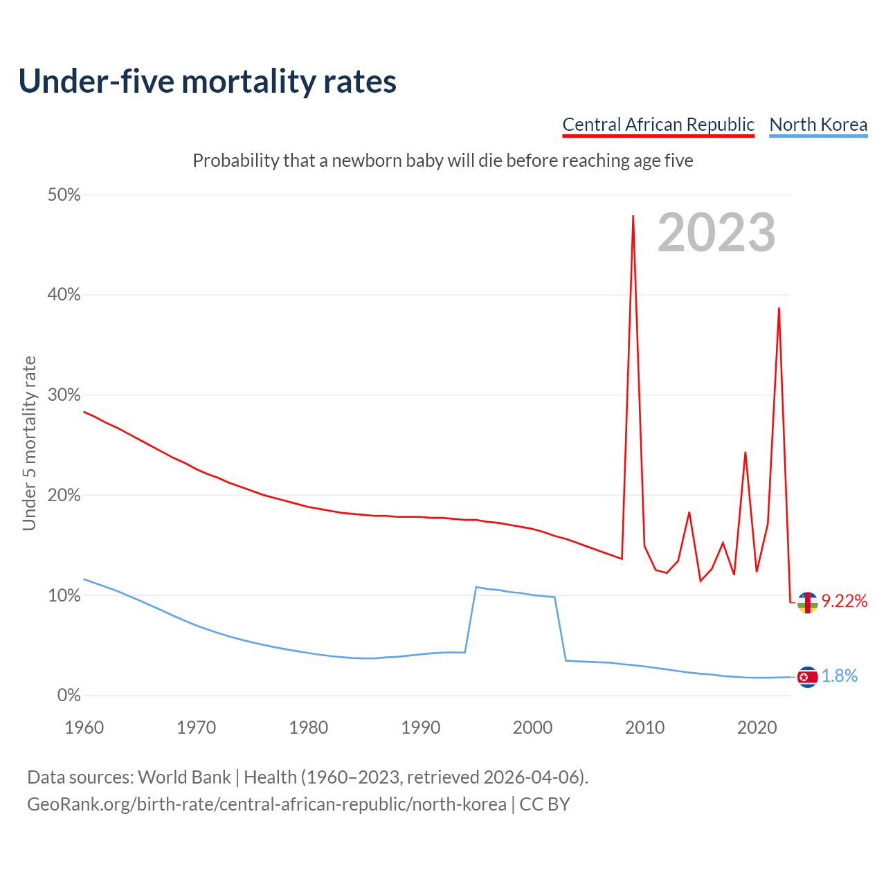 The chance that a newborn baby will die before reaching age five is 9.22% in the Central African Republic and 1.8% in North Korea. Above is a chart with historical data on under-five mortality rates.