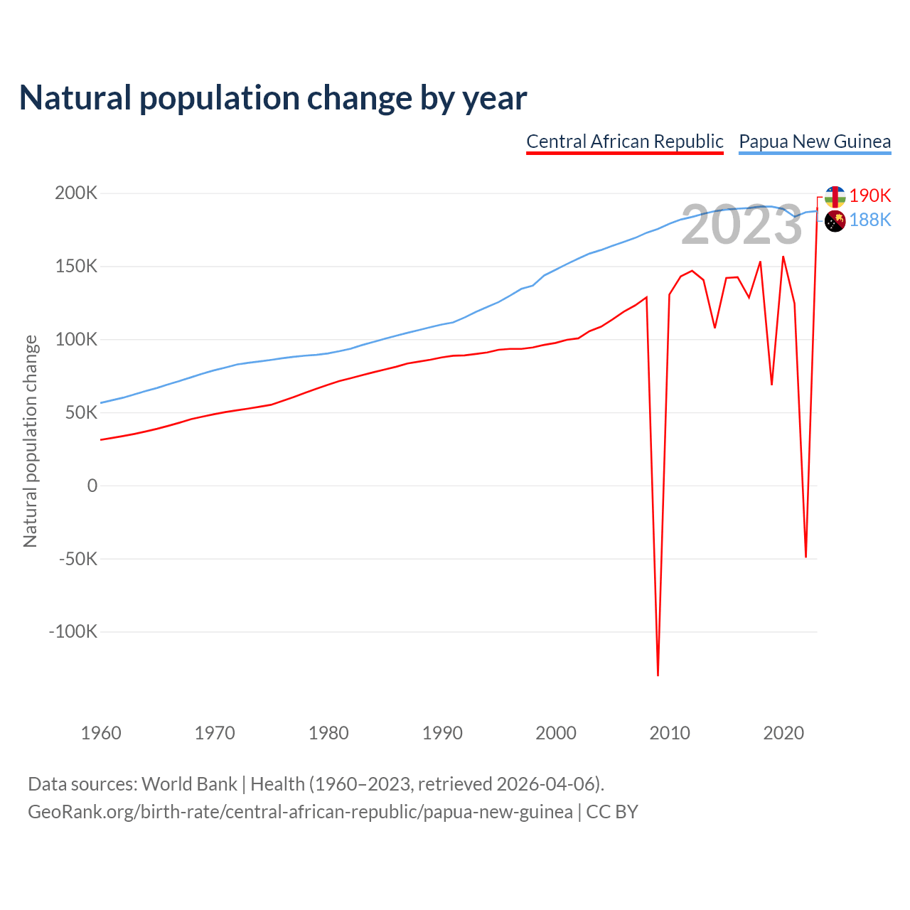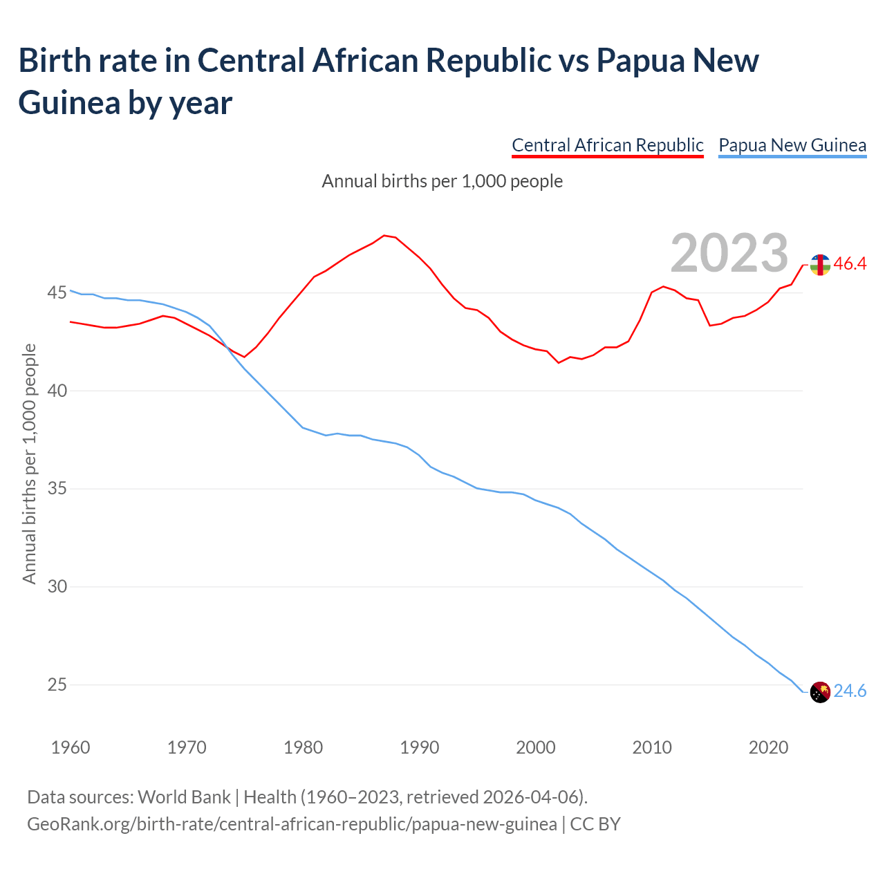 The Central African Republic has an annual birth rate of 46.4 births per 1,000 people, compared to 24.6 for Papua New Guinea. The average number of children a woman is expected to have during her lifetime — the fertility rate, is 6.01 in the Central African Republic and 3.1 in Papua New Guinea — 48.5% difference.