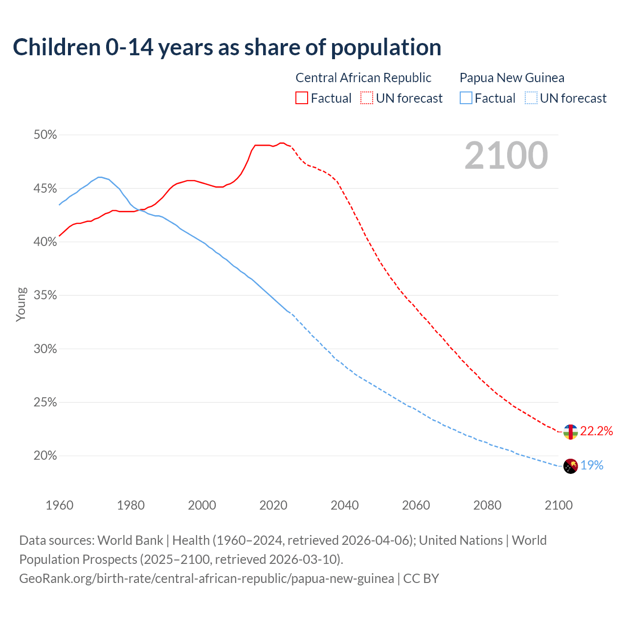 According to the latest available data on birth rates, the fertility rate in the Central African Republic was 6.01 children per woman in 2023, compared to 3.1 in Papua New Guinea in 2023. The replacement level is considered to be 2.1 children per woman.