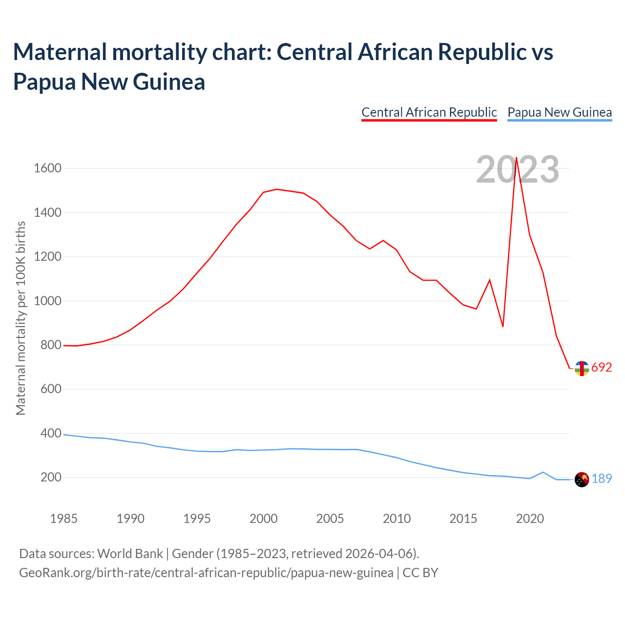The maternal mortality rate, which is the probability of dying during childbirth or within 42 days of pregnancy termination, is 692 deaths per 100,000 live births in the Central African Republic, compared to 189 deaths in Papua New Guinea.