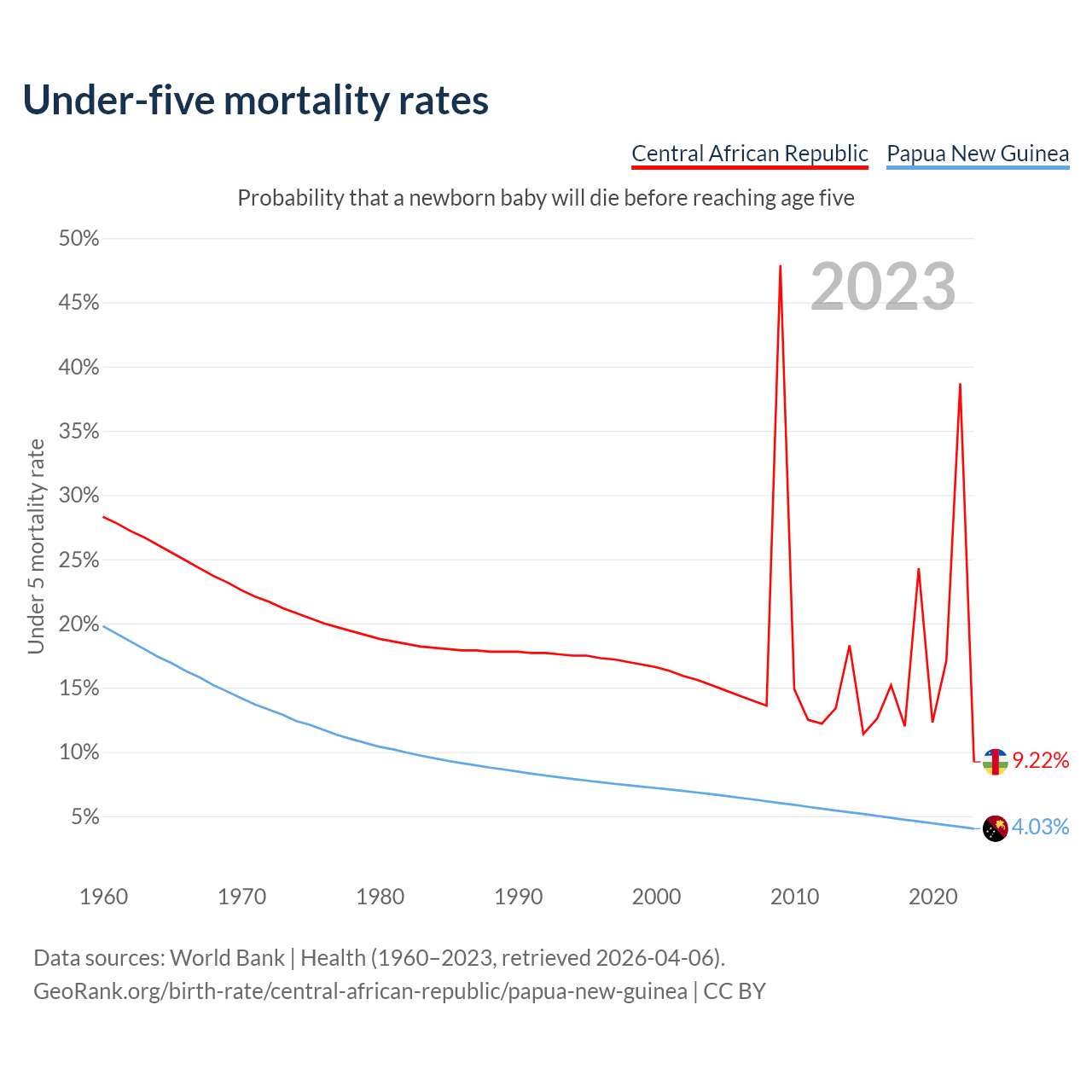 The chance that a newborn baby will die before reaching age five is 9.22% in the Central African Republic and 4.03% in Papua New Guinea. Above is a chart with historical data on under-five mortality rates.