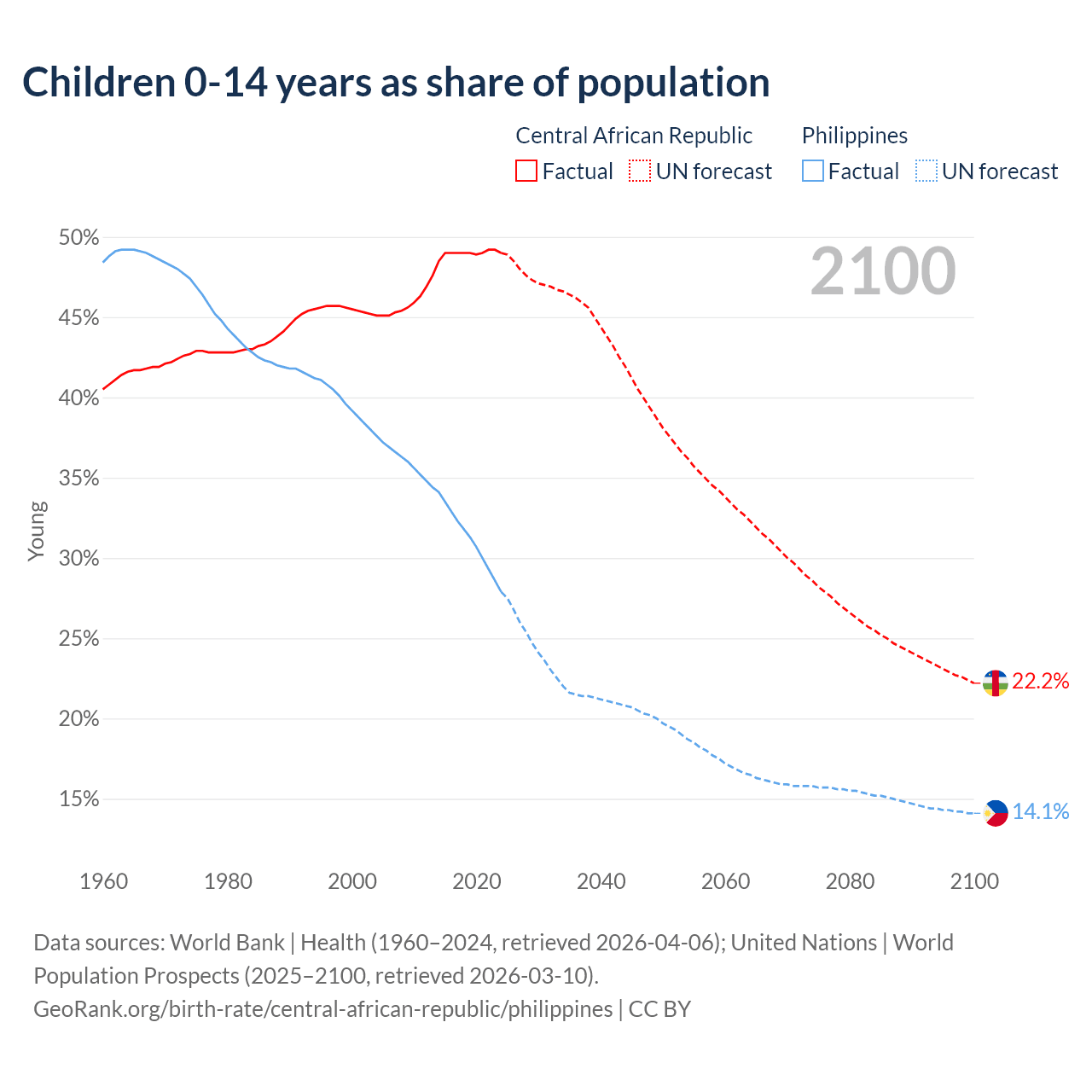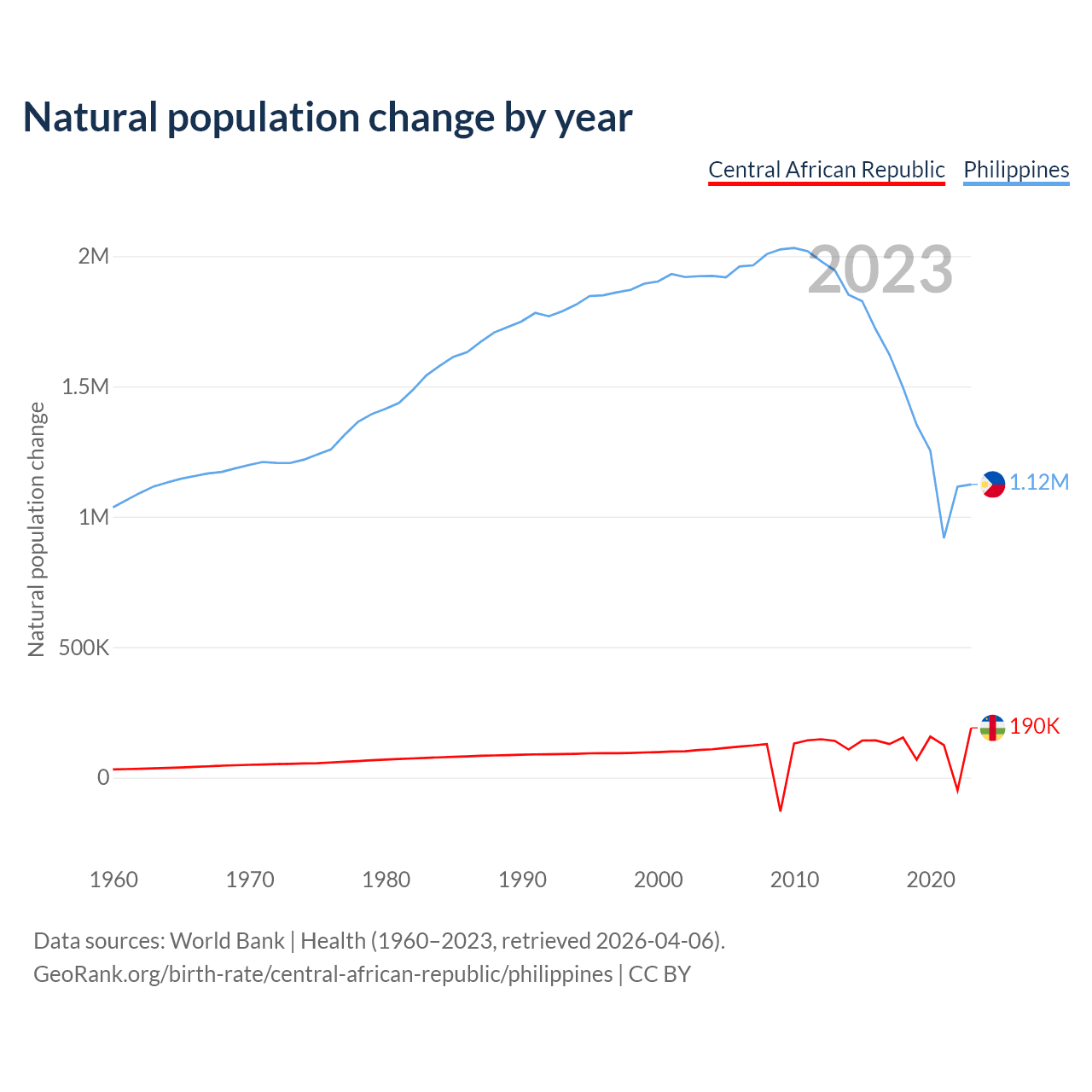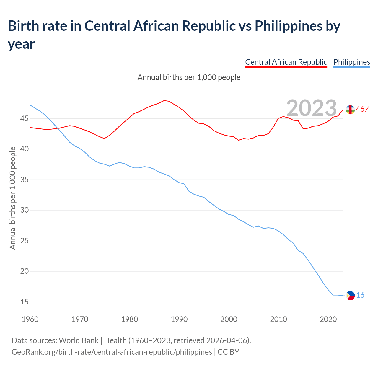 According to the latest available data on birth rates, the fertility rate in the Central African Republic was 6.01 children per woman in 2023, compared to 1.92 in the Philippines in 2023. The replacement level is considered to be 2.1 children per woman.