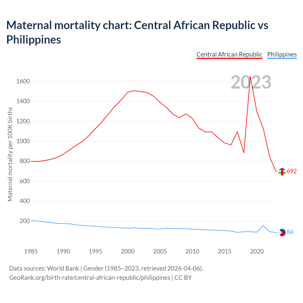 The maternal mortality rate, which is the probability of dying during childbirth or within 42 days of pregnancy termination, is 692 deaths per 100,000 live births in the Central African Republic, compared to 84 deaths in the Philippines.