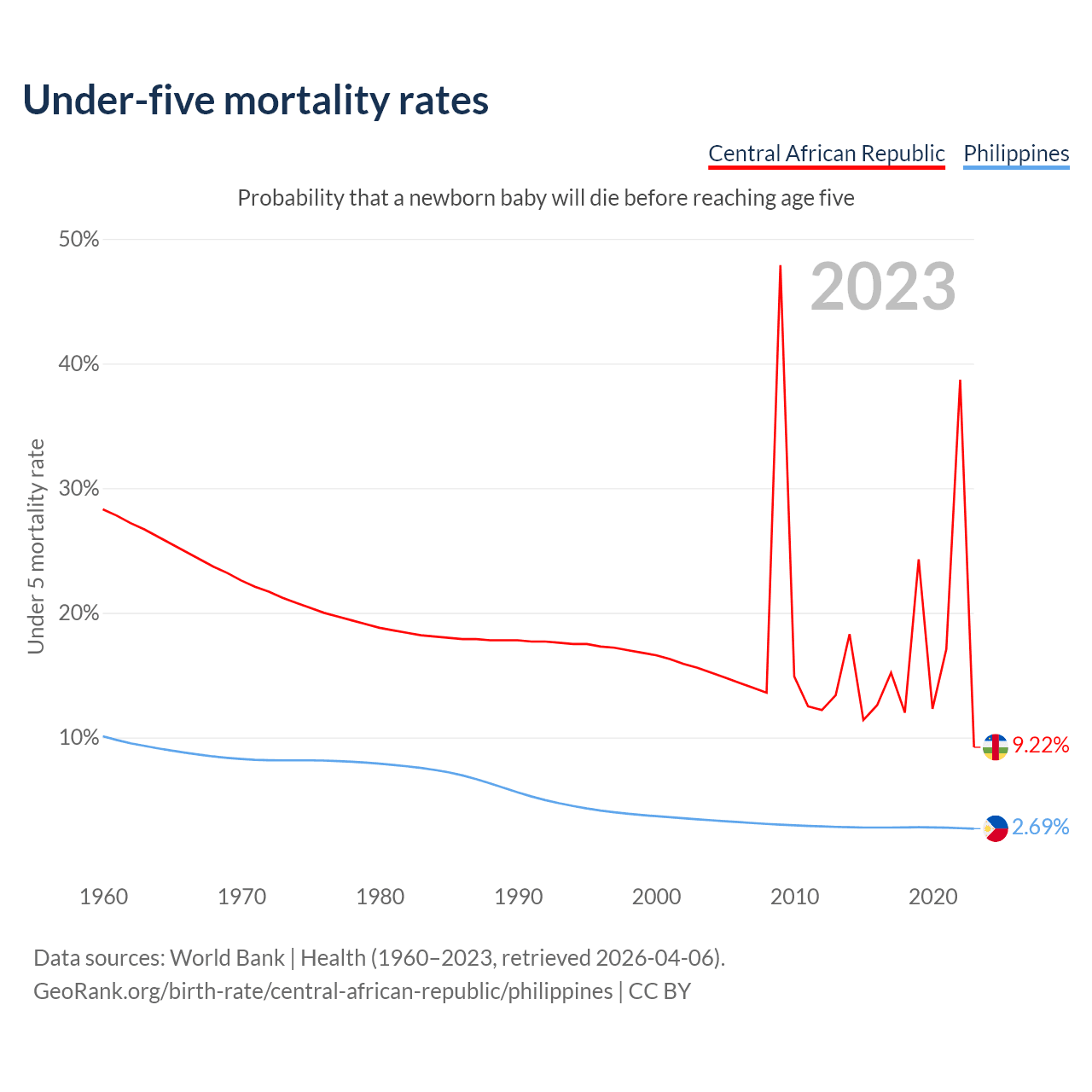 The chance that a newborn baby will die before reaching age five is 9.22% in the Central African Republic and 2.69% in the Philippines. Above is a chart with historical data on under-five mortality rates.