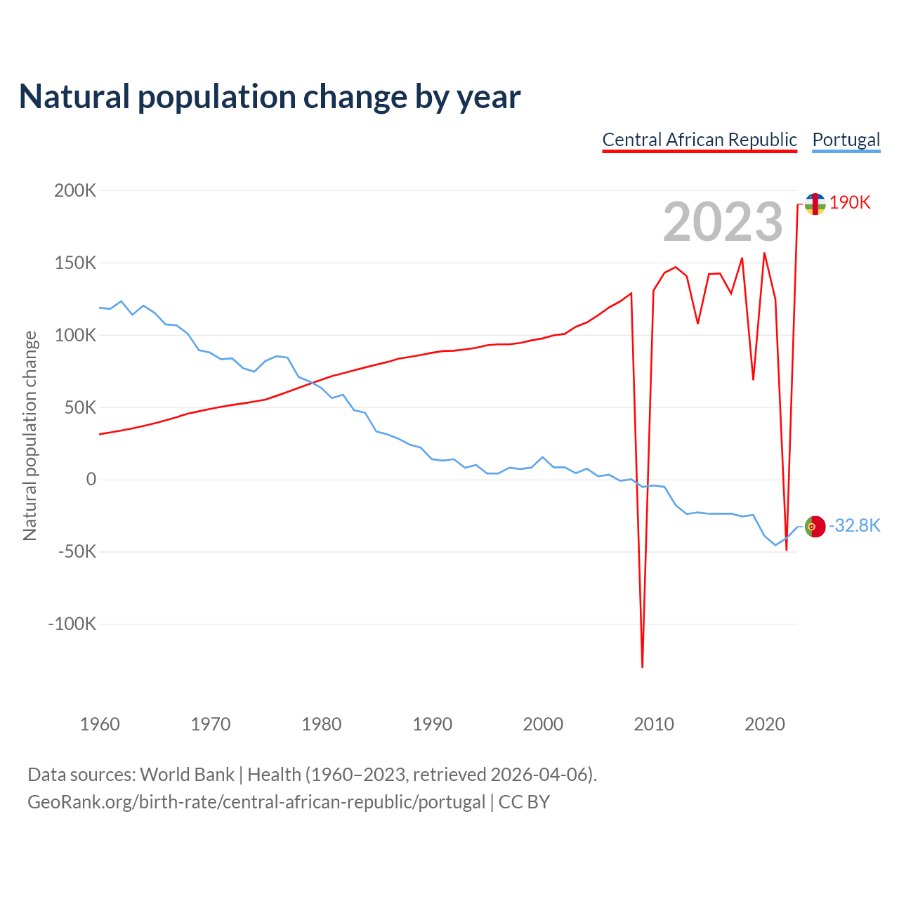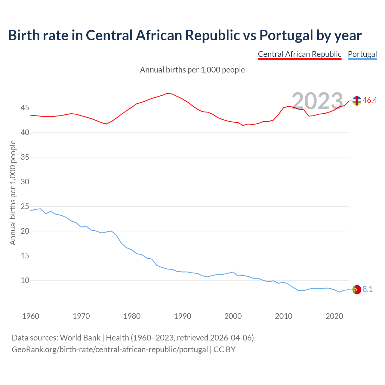 The Central African Republic has an annual birth rate of 46.4 births per 1,000 people, compared to 8.1 for Portugal. The average number of children a woman is expected to have during her lifetime — the fertility rate, is 6.01 in the Central African Republic and 1.44 in Portugal — 76% difference.