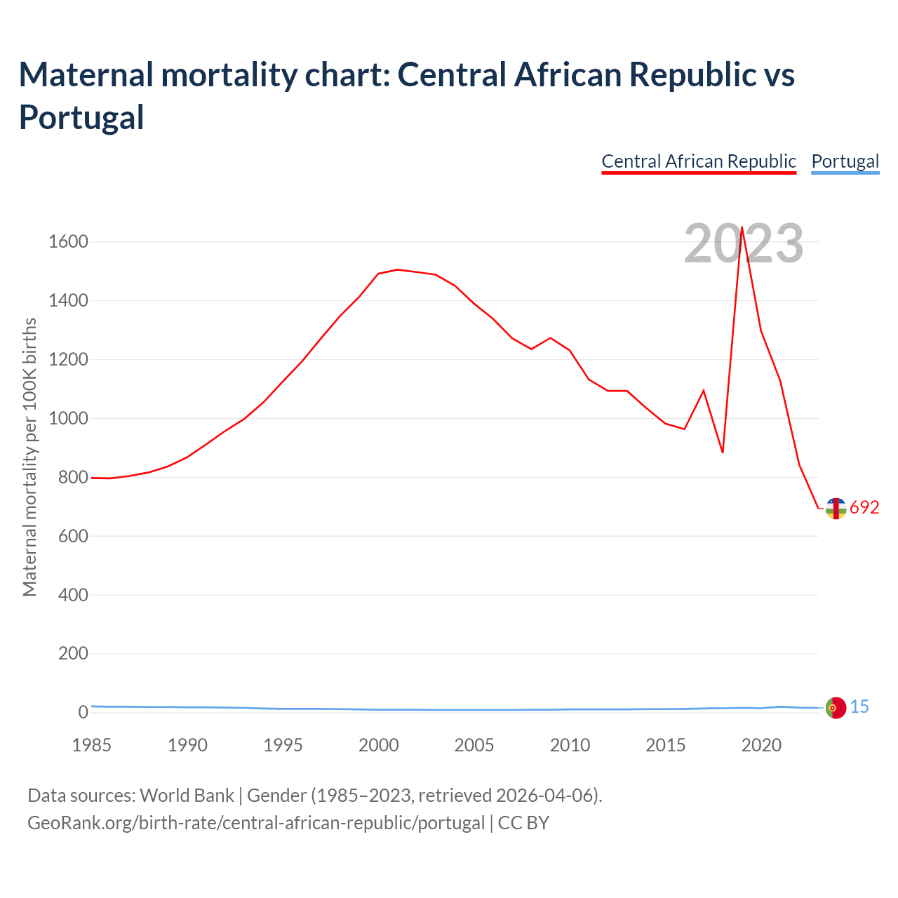 The maternal mortality rate, which is the probability of dying during childbirth or within 42 days of pregnancy termination, is 692 deaths per 100,000 live births in the Central African Republic, compared to 15 deaths in Portugal.