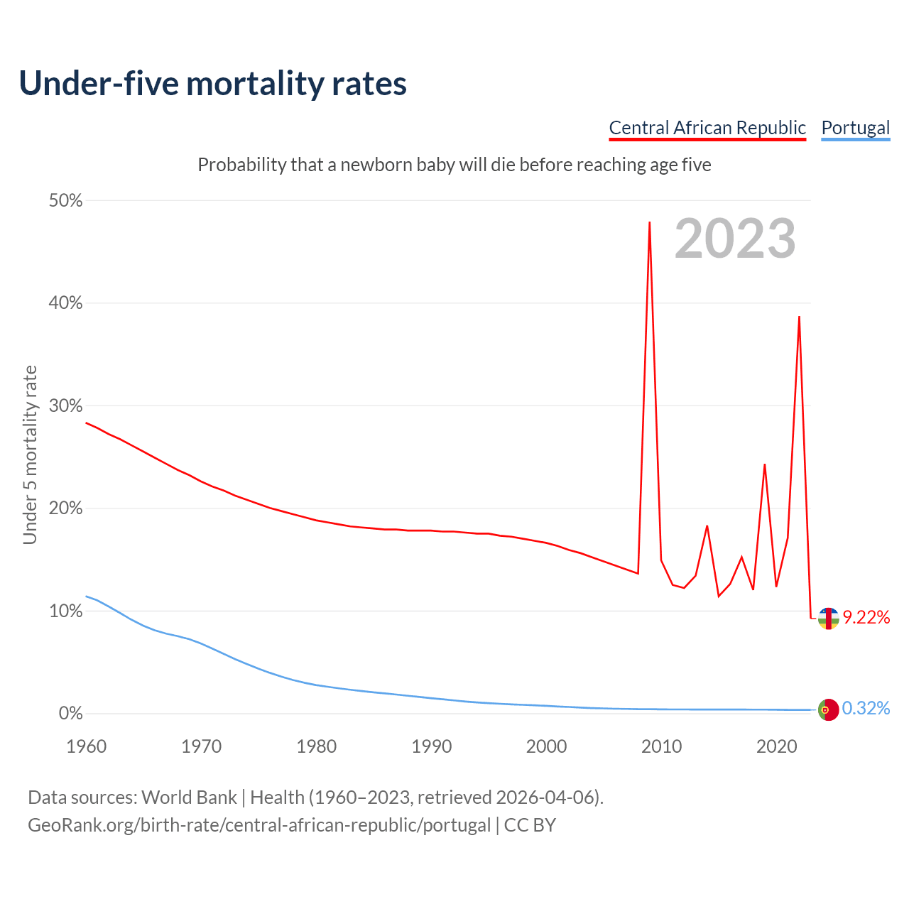 The chance that a newborn baby will die before reaching age five is 9.22% in the Central African Republic and 0.32% in Portugal. Above is a chart with historical data on under-five mortality rates.