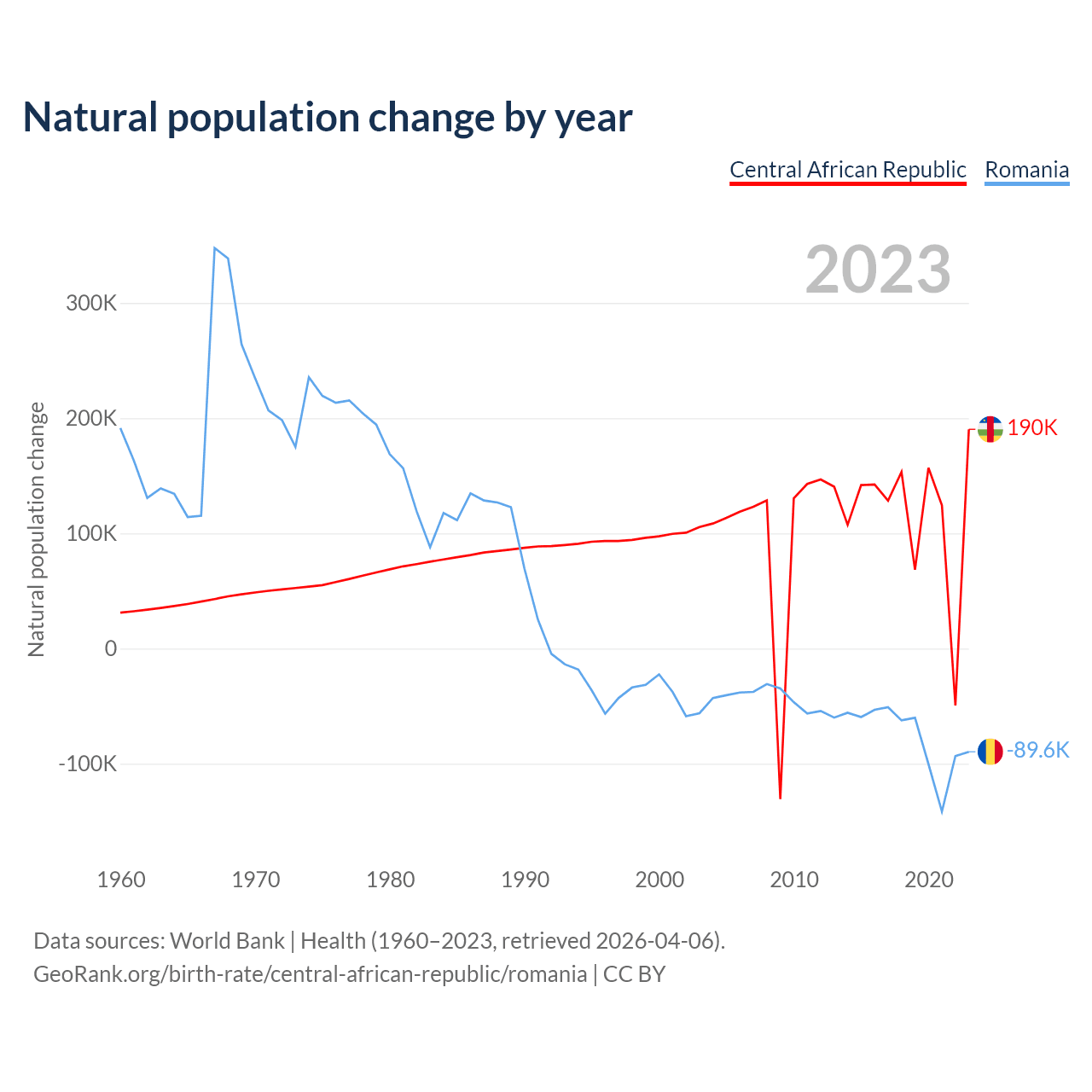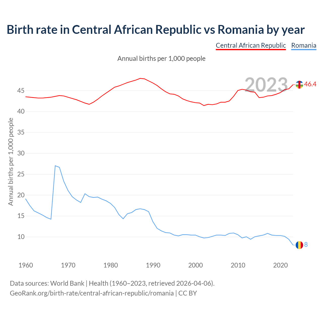 The Central African Republic has an annual birth rate of 46.4 births per 1,000 people, compared to 8 for Romania. The average number of children a woman is expected to have during her lifetime — the fertility rate, is 6.01 in the Central African Republic and 1.71 in Romania — 71.6% difference.