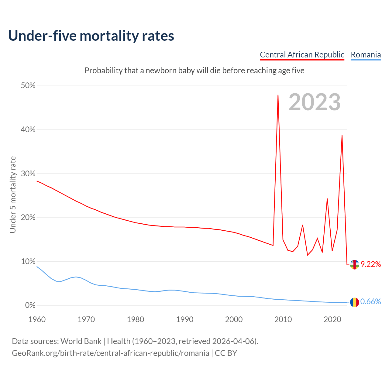 The chance that a newborn baby will die before reaching age five is 9.22% in the Central African Republic and 0.66% in Romania. Above is a chart with historical data on under-five mortality rates.