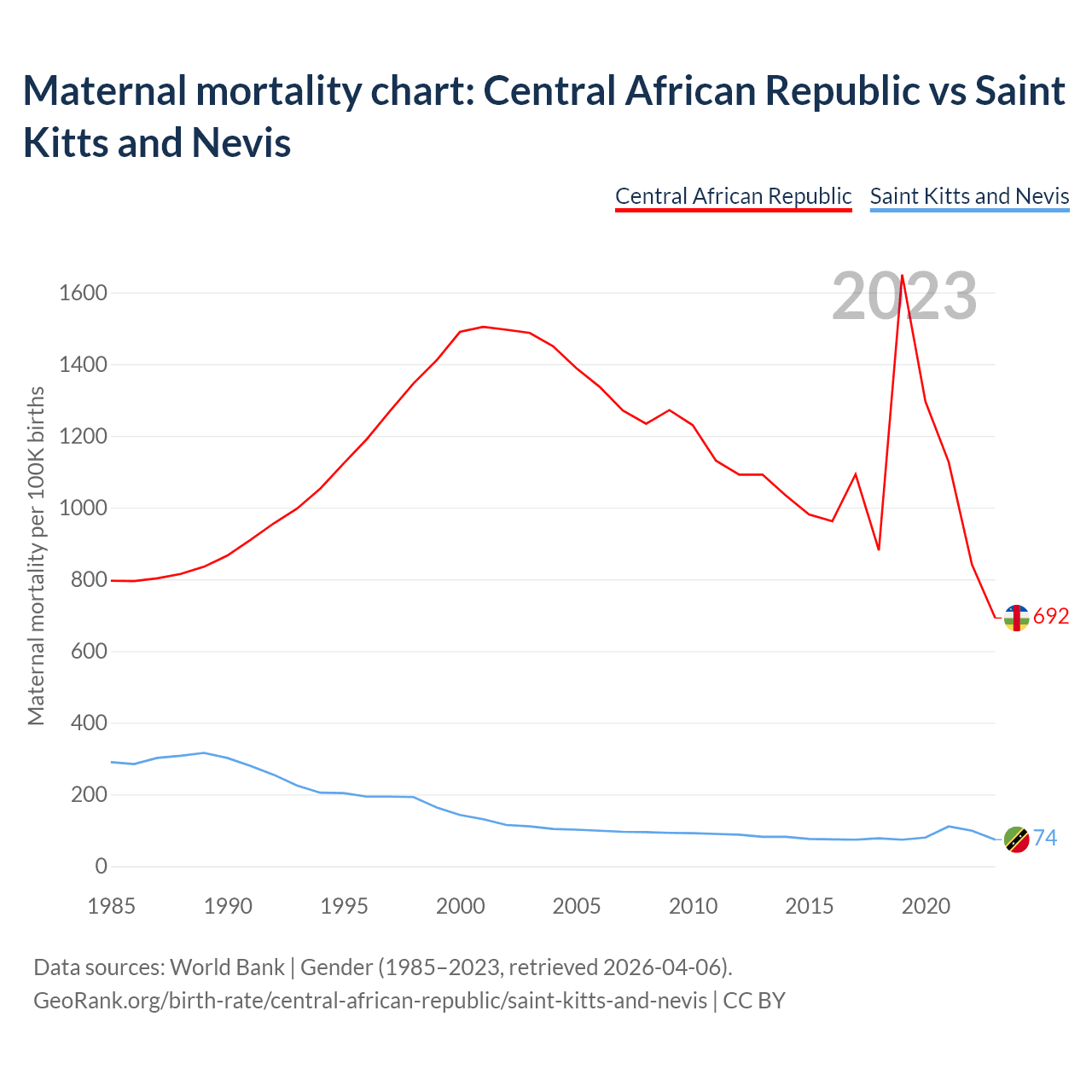The maternal mortality rate, which is the probability of dying during childbirth or within 42 days of pregnancy termination, is 692 deaths per 100,000 live births in the Central African Republic, compared to 74 deaths in Saint Kitts and Nevis.