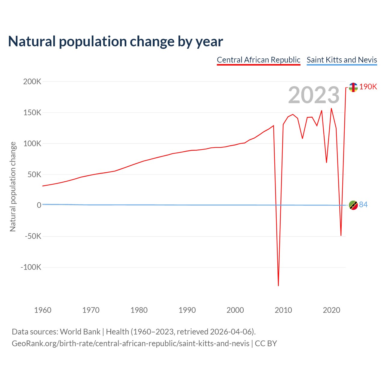 1960 vs 2023, the fertility rate has changed by +1.08% in the Central African Republic and by 77% in Saint Kitts and Nevis — in 1960, it was 5.95 and 6.54, respectively.