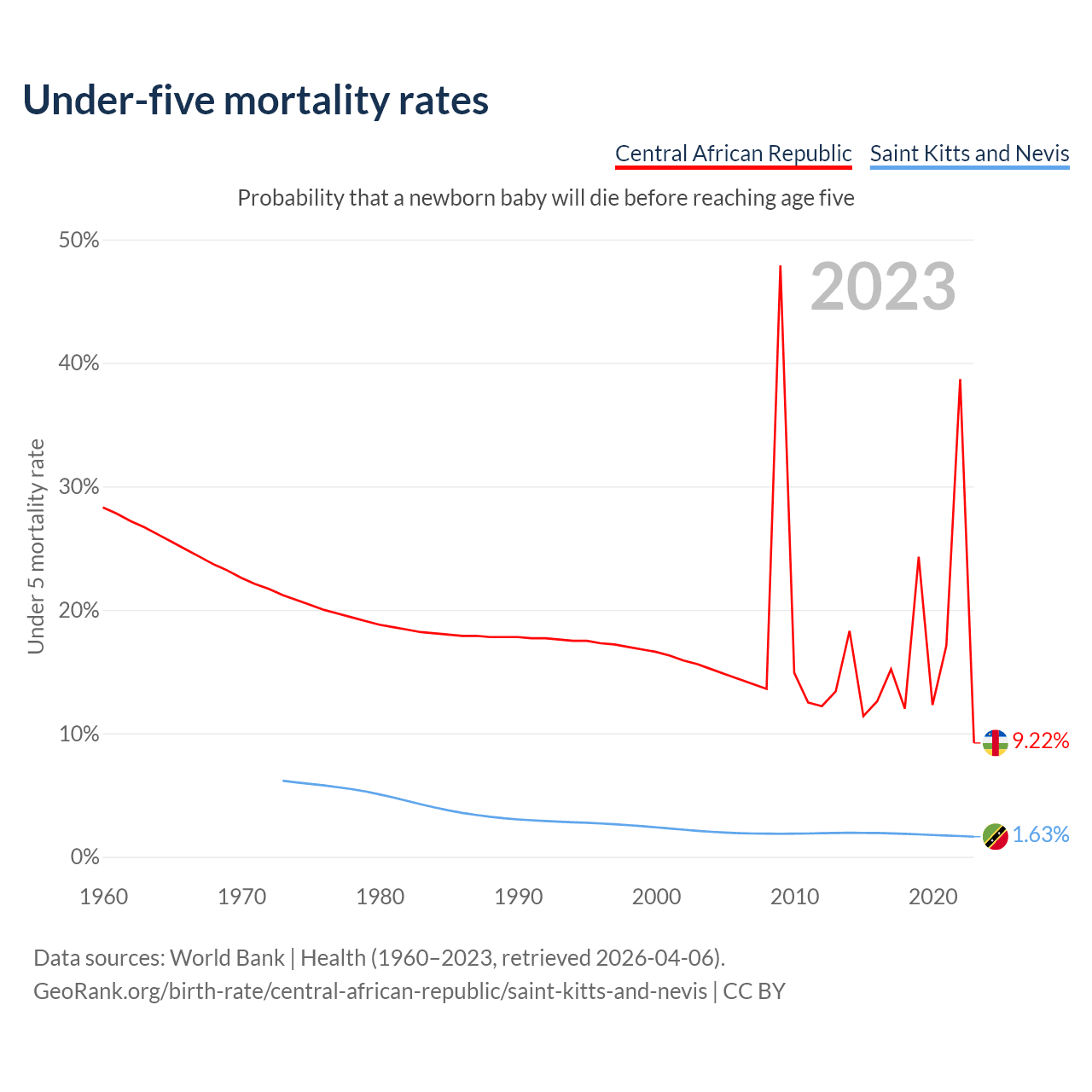 The chance that a newborn baby will die before reaching age five is 9.22% in the Central African Republic and 1.63% in Saint Kitts and Nevis. Above is a chart with historical data on under-five mortality rates.