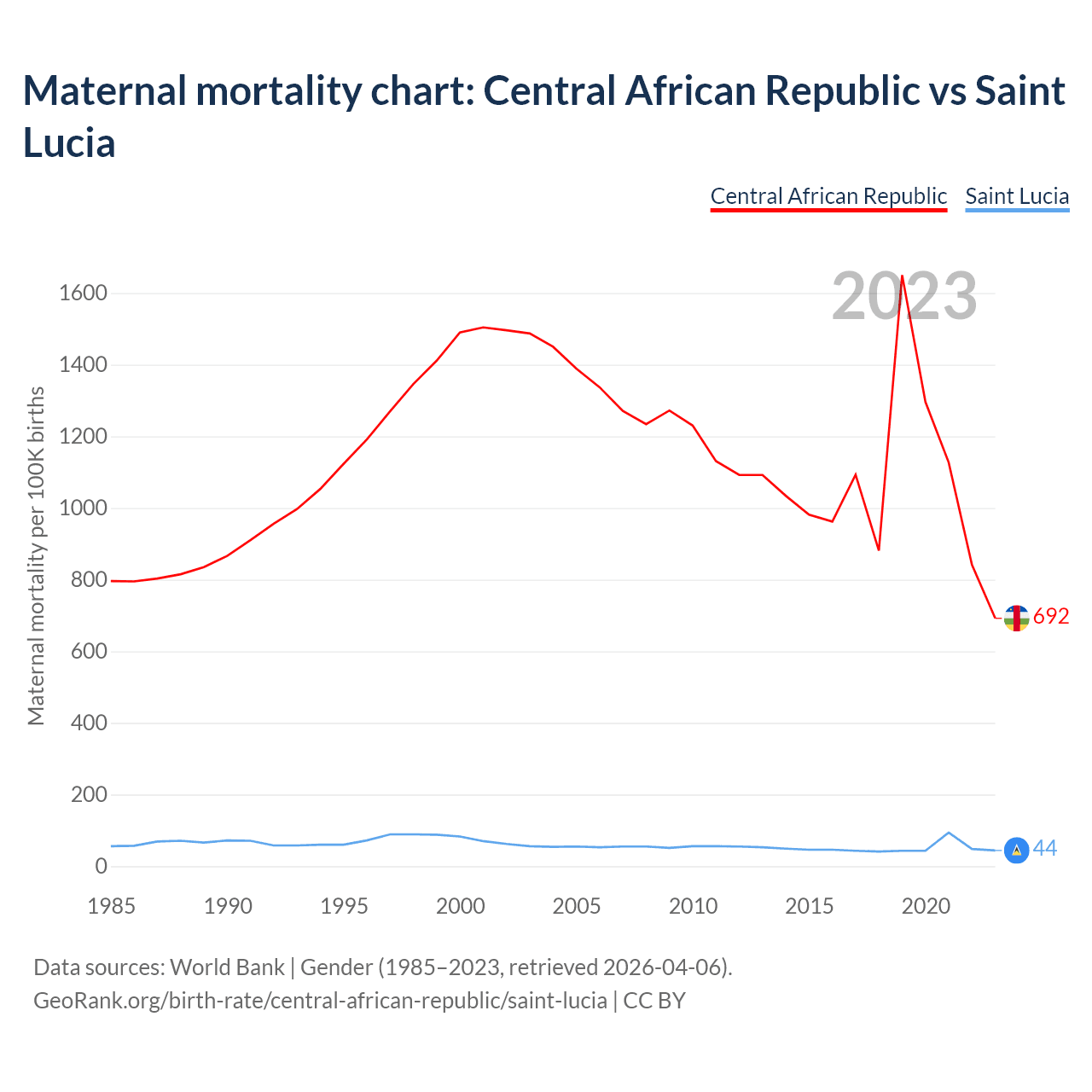 The maternal mortality rate, which is the probability of dying during childbirth or within 42 days of pregnancy termination, is 692 deaths per 100,000 live births in the Central African Republic, compared to 44 deaths in Saint Lucia.