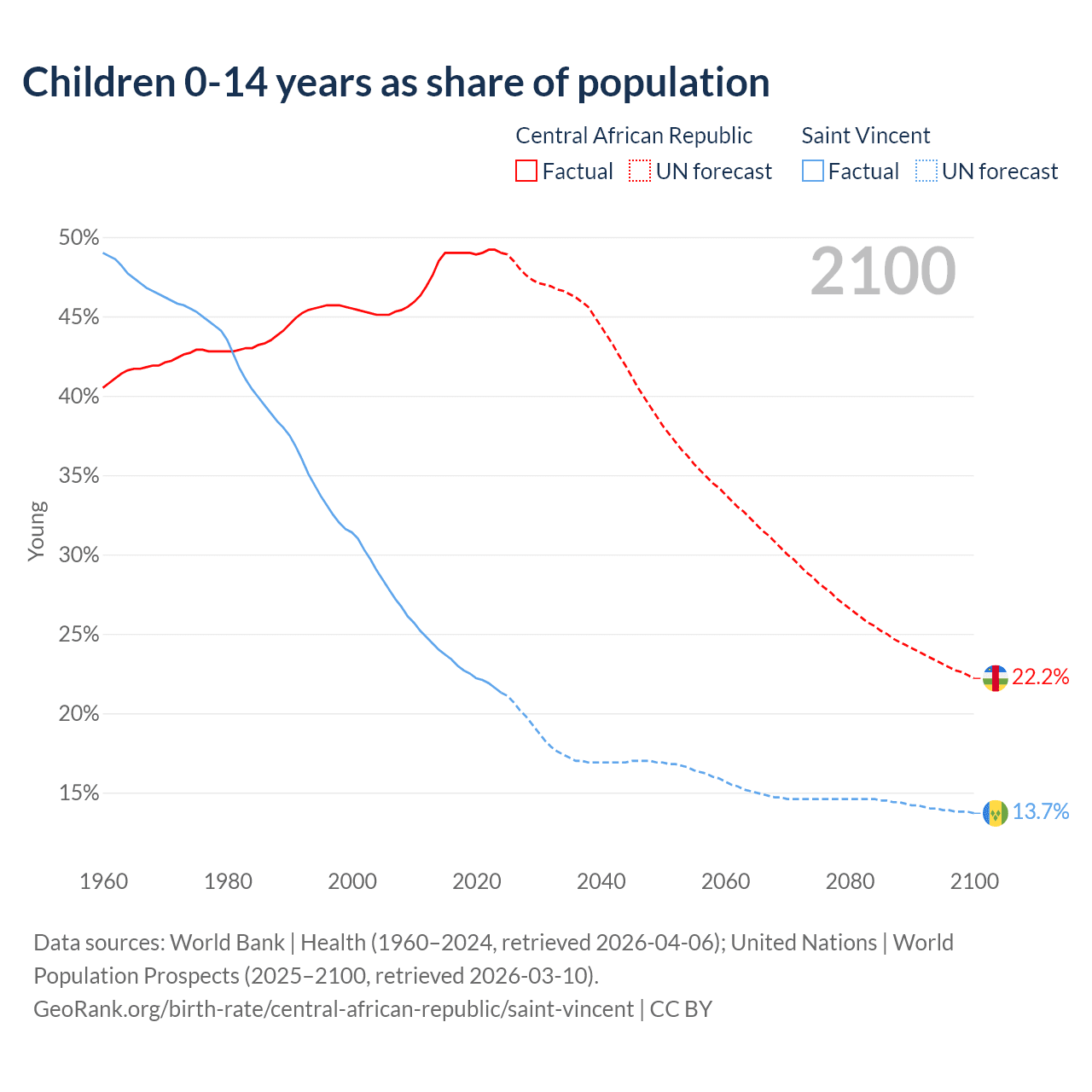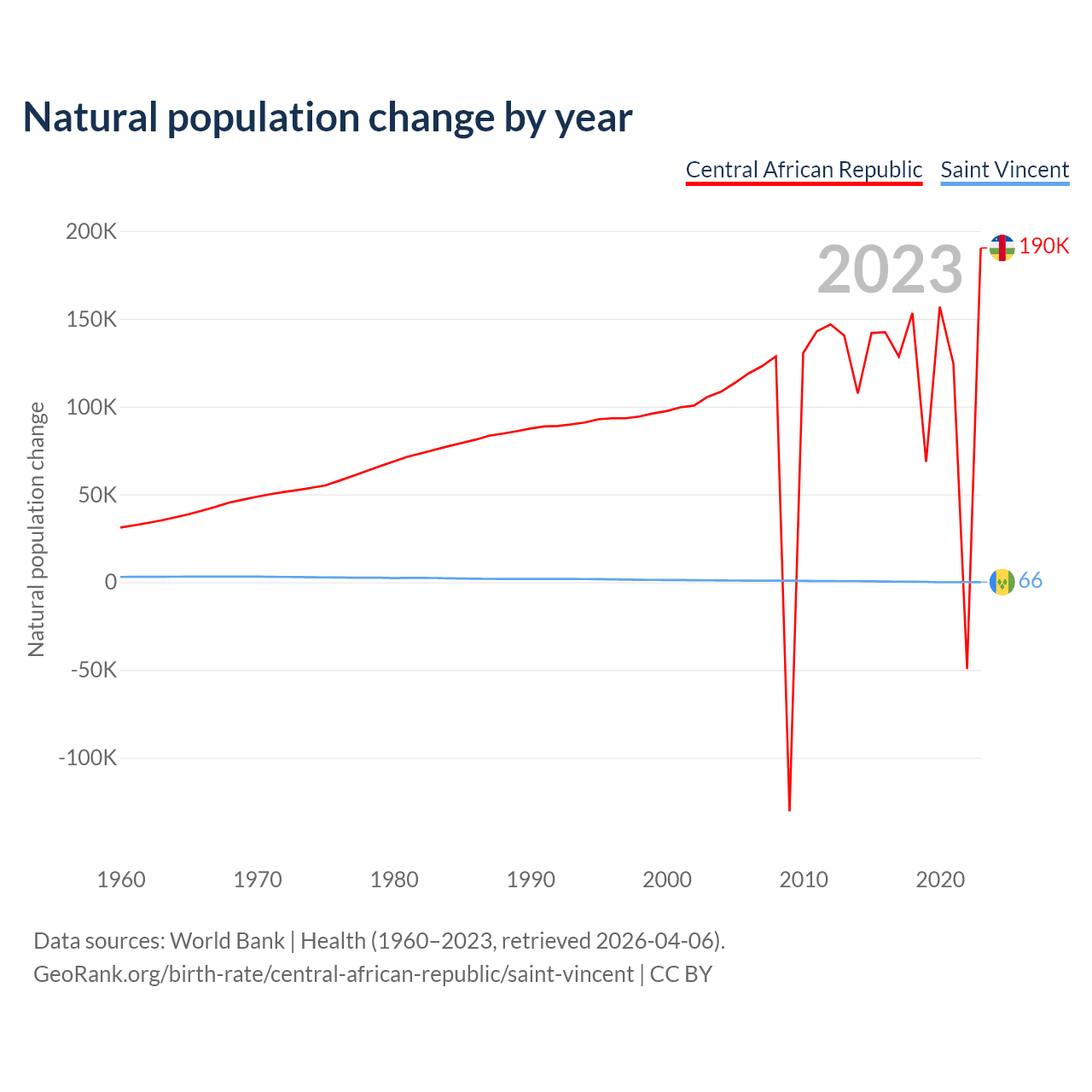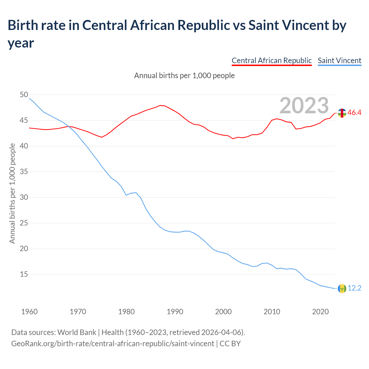 The Central African Republic has an annual birth rate of 46.4 births per 1,000 people, compared to 12.2 for Saint Vincent. The average number of children a woman is expected to have during her lifetime — the fertility rate, is 6.01 in the Central African Republic and 1.78 in Saint Vincent — 70.5% difference.