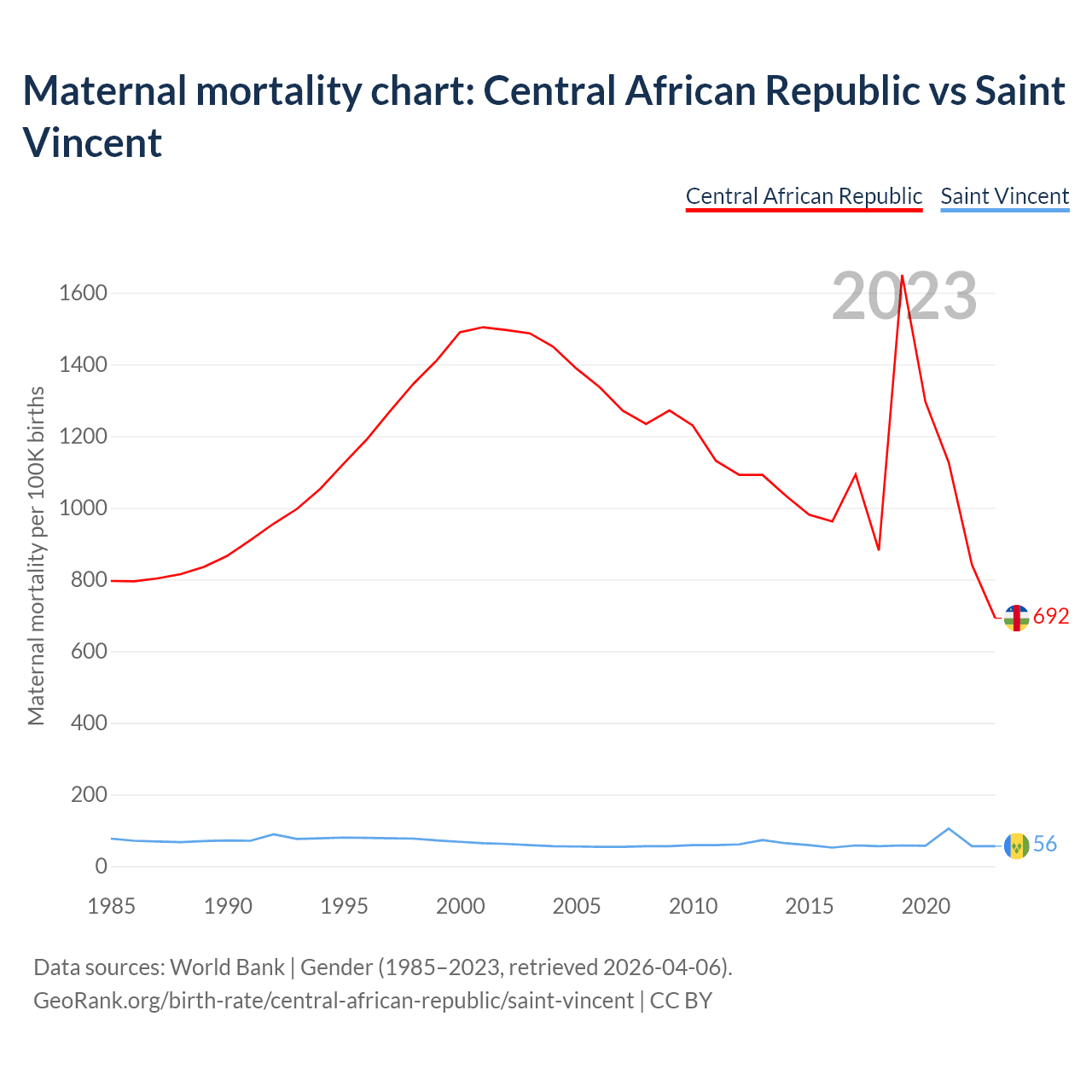 The maternal mortality rate, which is the probability of dying during childbirth or within 42 days of pregnancy termination, is 692 deaths per 100,000 live births in the Central African Republic, compared to 56 deaths in Saint Vincent.