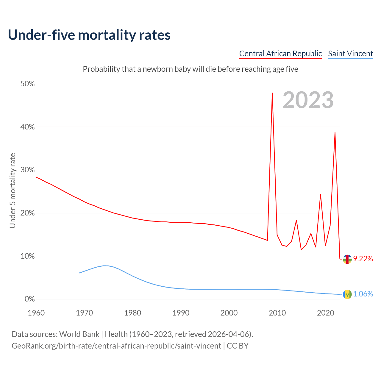 The chance that a newborn baby will die before reaching age five is 9.22% in the Central African Republic and 1.06% in Saint Vincent. Above is a chart with historical data on under-five mortality rates.