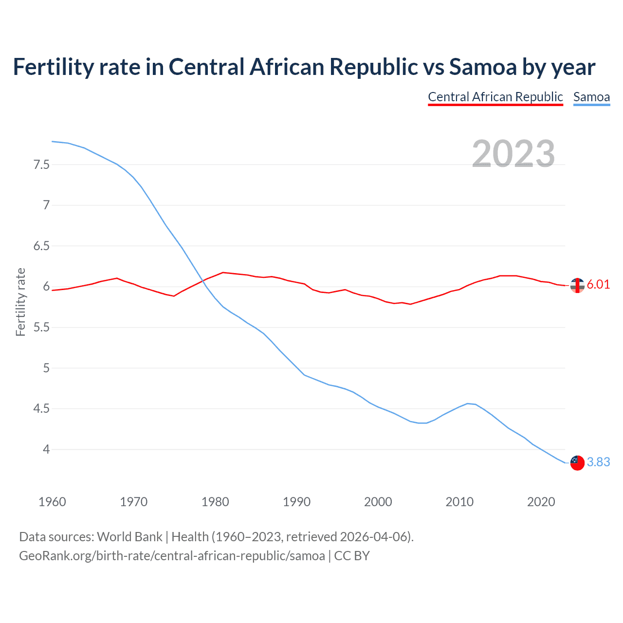 According to the latest available data on birth rates, the fertility rate in the Central African Republic was 6.01 children per woman in 2023, compared to 3.83 in Samoa in 2023. The replacement level is considered to be 2.1 children per woman.