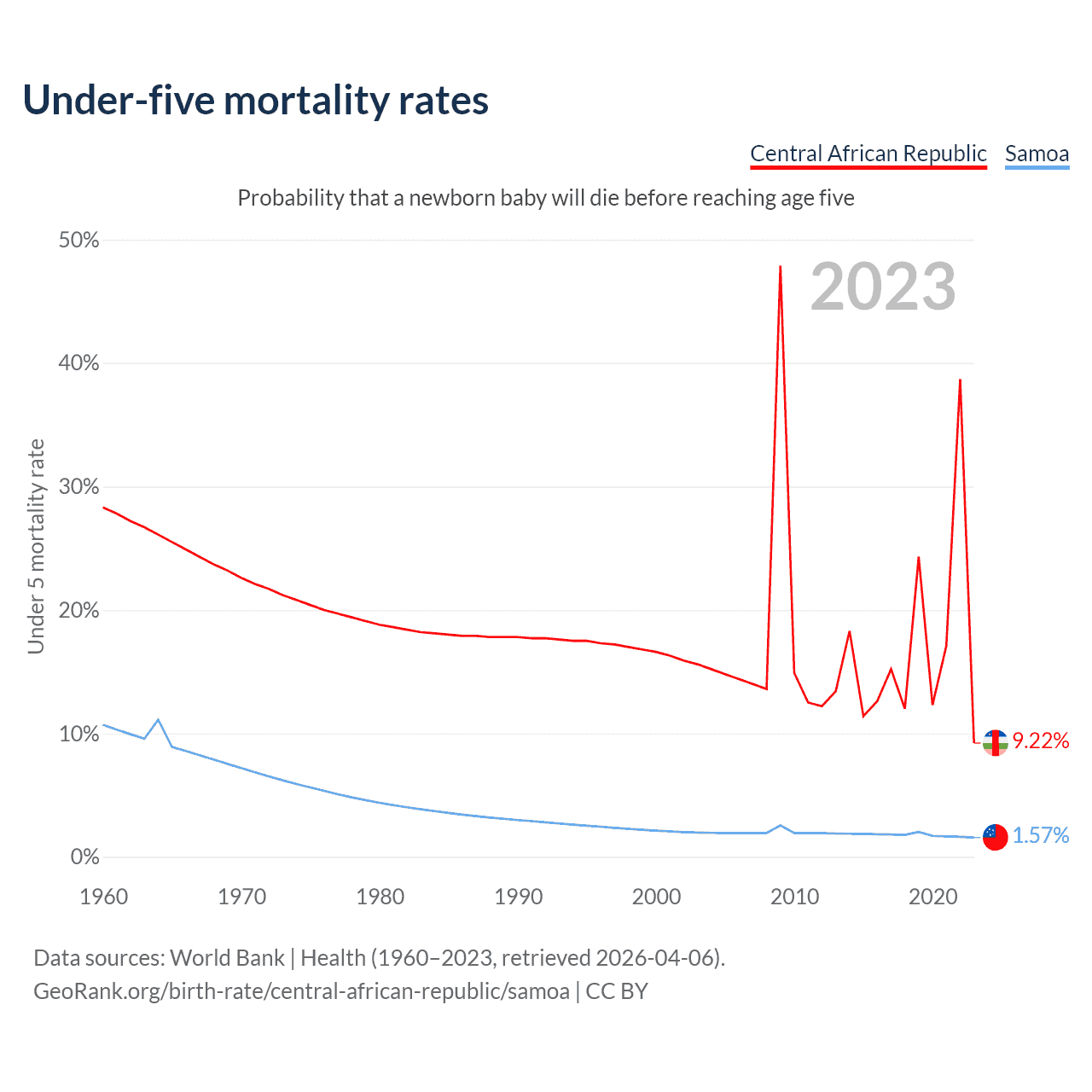 The chance that a newborn baby will die before reaching age five is 9.22% in the Central African Republic and 1.57% in Samoa. Above is a chart with historical data on under-five mortality rates.