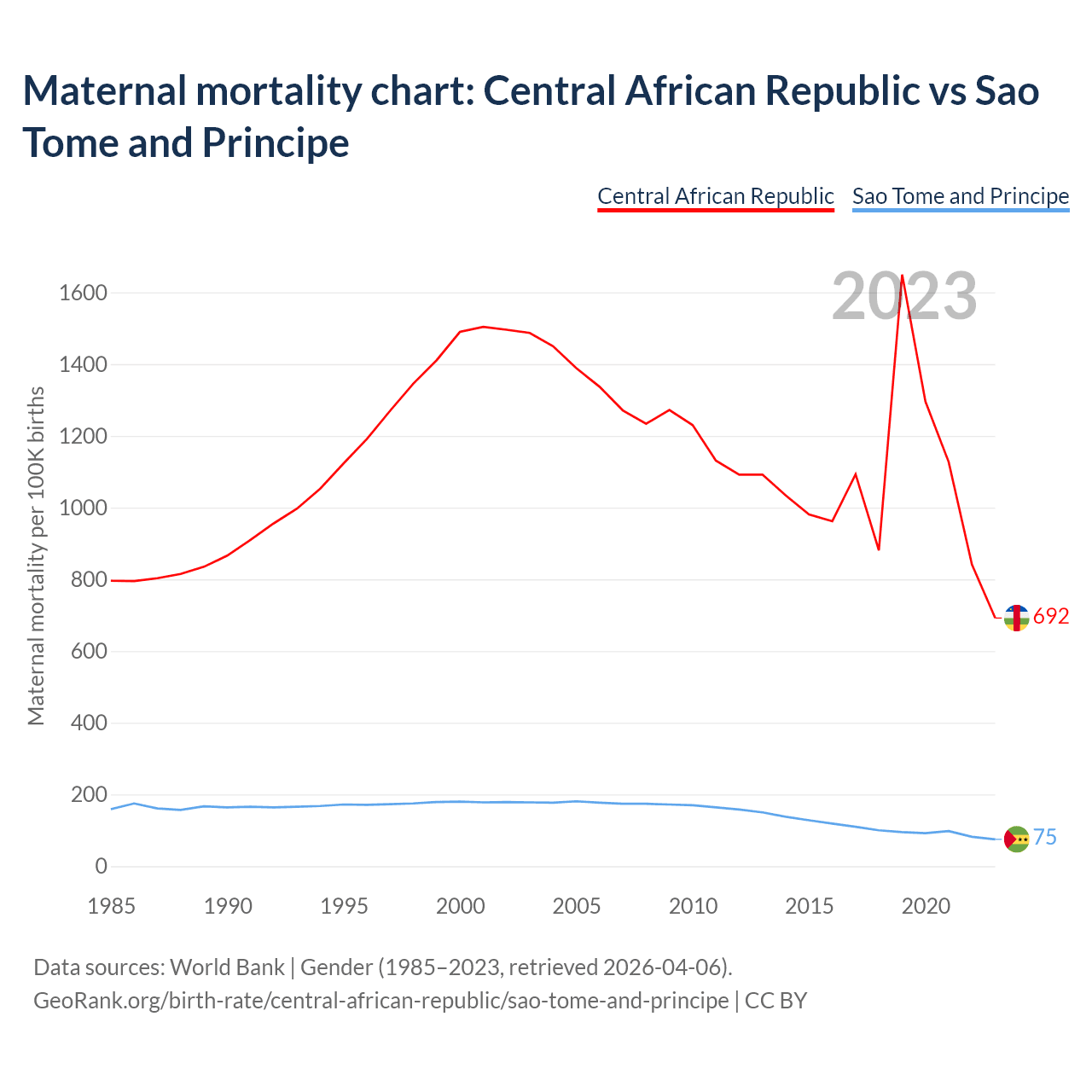 The maternal mortality rate, which is the probability of dying during childbirth or within 42 days of pregnancy termination, is 692 deaths per 100,000 live births in the Central African Republic, compared to 75 deaths in Sao Tome and Principe.