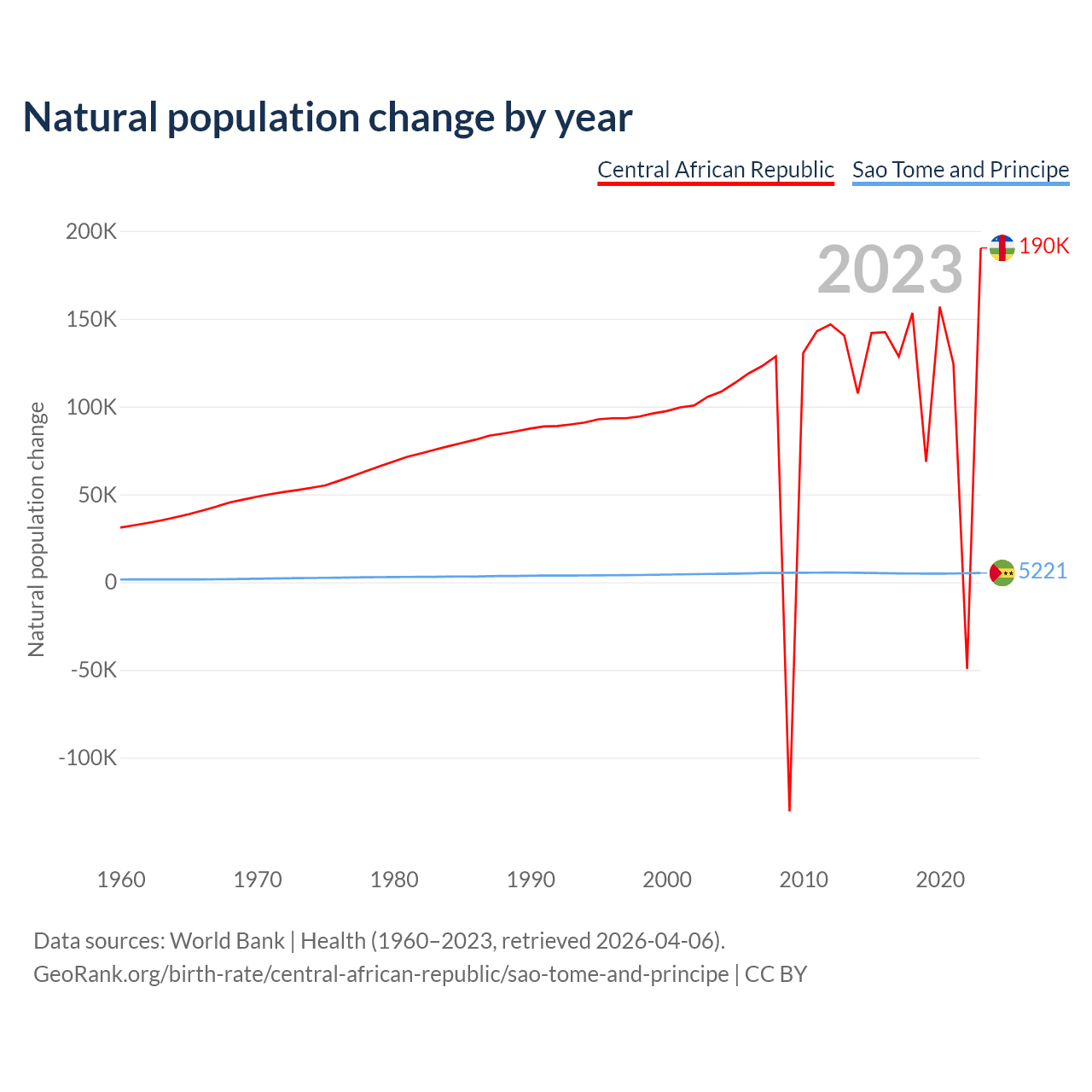 The Central African Republic has an annual birth rate of 46.4 births per 1,000 people, compared to 28.2 for Sao Tome and Principe. The average number of children a woman is expected to have during her lifetime — the fertility rate, is 6.01 in the Central African Republic and 3.64 in Sao Tome and Principe — 39.4% difference.
