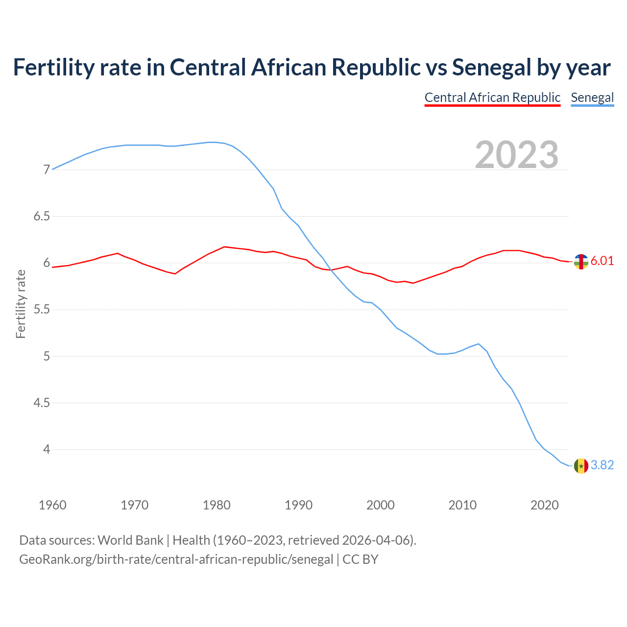 1960 vs 2023, the fertility rate has changed by +1.08% in the Central African Republic and by 45.4% in Senegal — in 1960, it was 5.95 and 7, respectively.