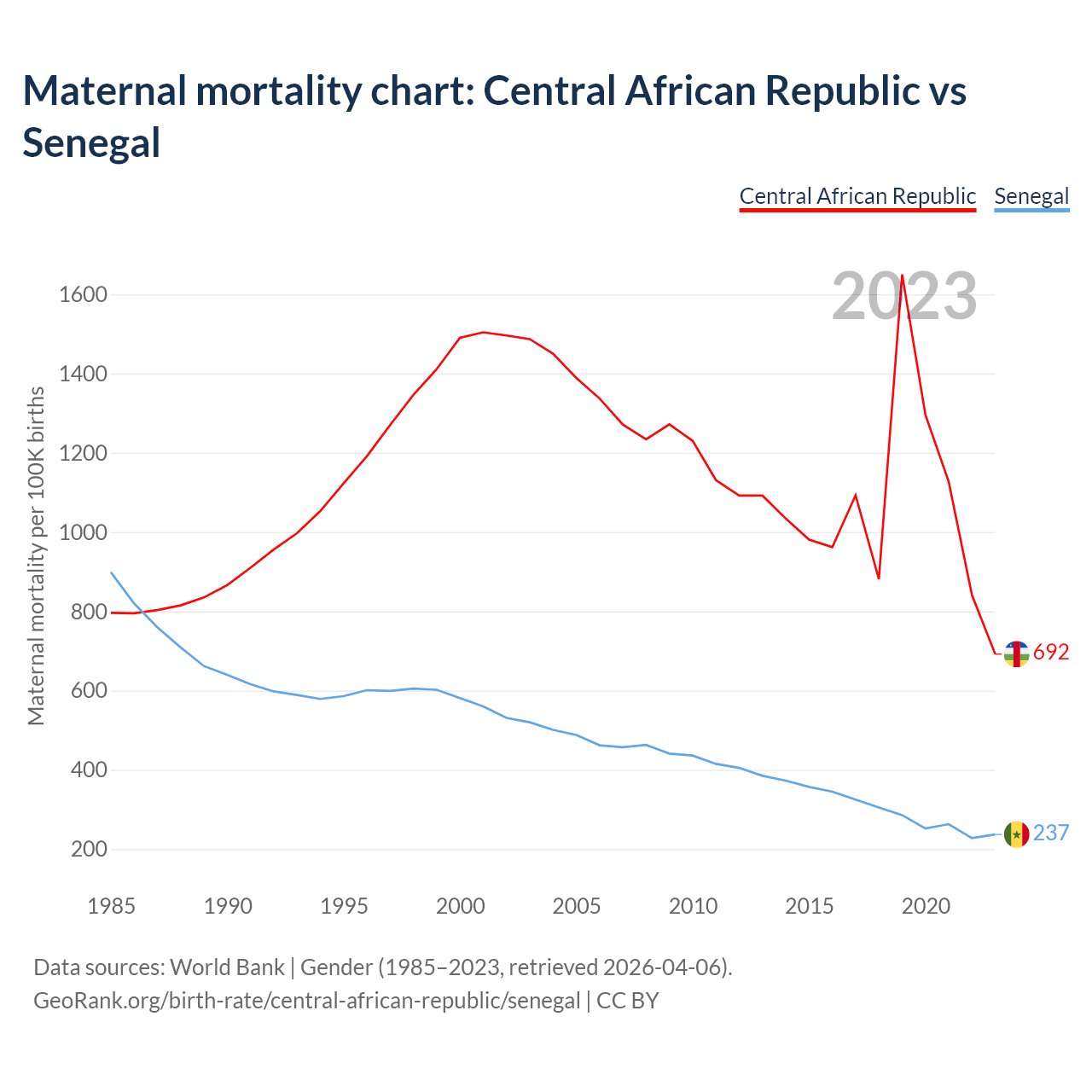 The maternal mortality rate, which is the probability of dying during childbirth or within 42 days of pregnancy termination, is 692 deaths per 100,000 live births in the Central African Republic, compared to 237 deaths in Senegal.