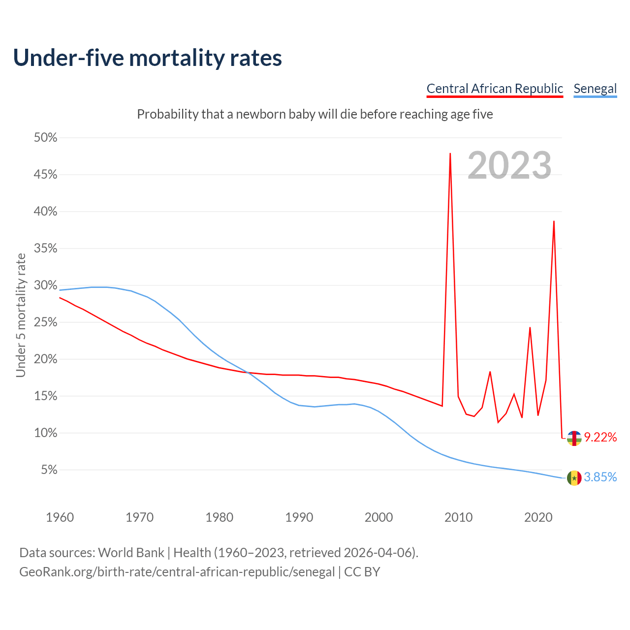 The chance that a newborn baby will die before reaching age five is 9.22% in the Central African Republic and 3.85% in Senegal. Above is a chart with historical data on under-five mortality rates.