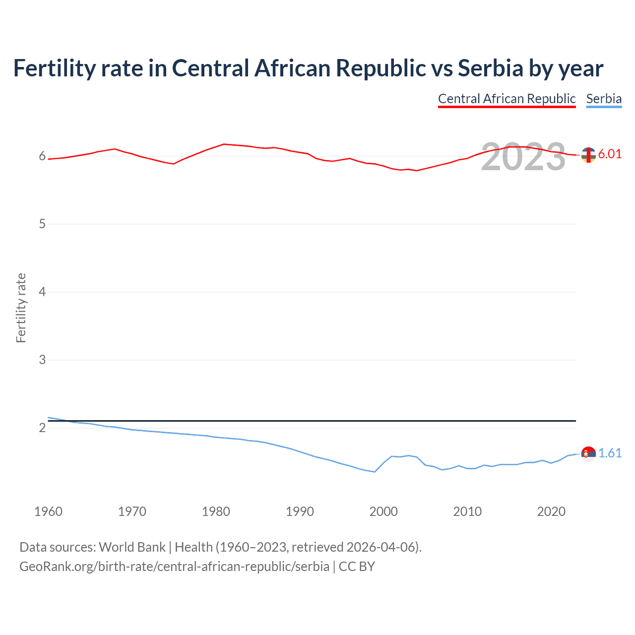 1960 vs 2023, the fertility rate has changed by +1.08% in the Central African Republic and by 25.3% in Serbia — in 1960, it was 5.95 and 2.15, respectively.