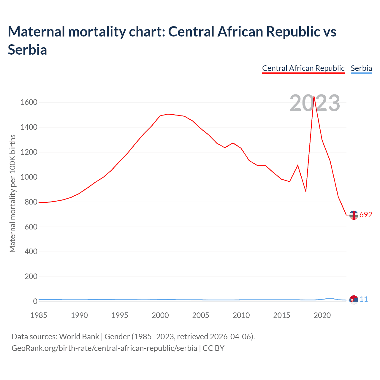 The maternal mortality rate, which is the probability of dying during childbirth or within 42 days of pregnancy termination, is 692 deaths per 100,000 live births in the Central African Republic, compared to 11 deaths in Serbia.