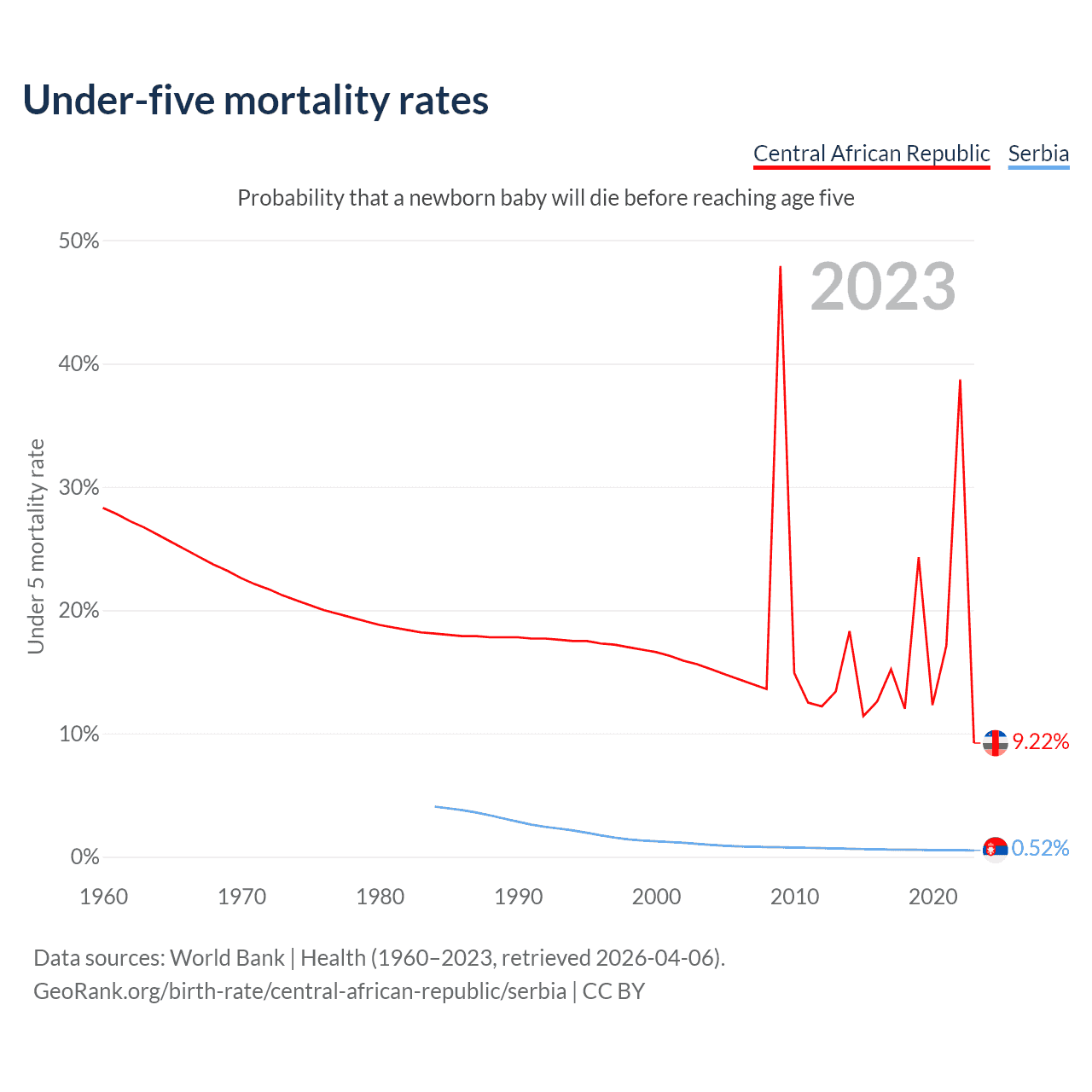The chance that a newborn baby will die before reaching age five is 9.22% in the Central African Republic and 0.52% in Serbia. Above is a chart with historical data on under-five mortality rates.