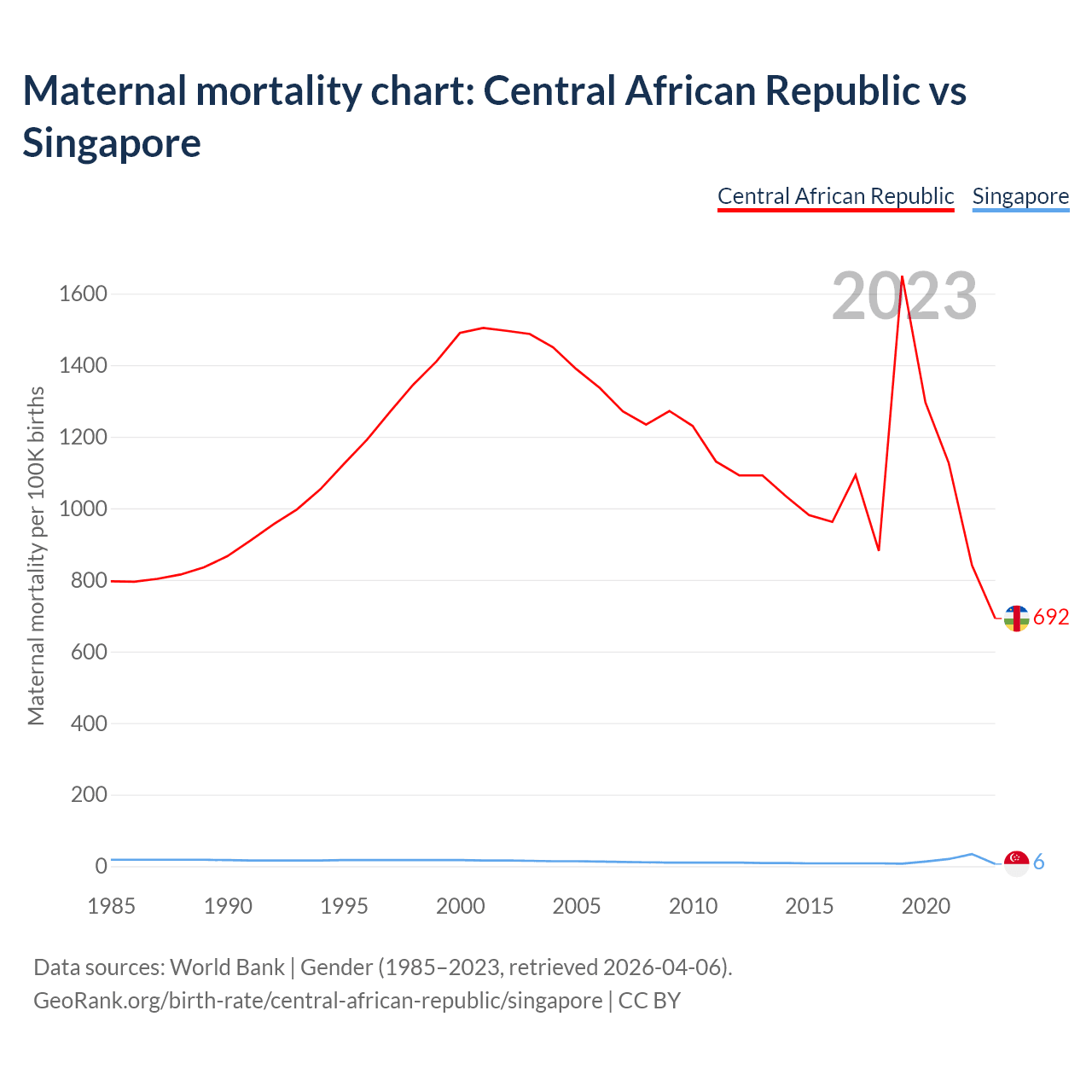 The maternal mortality rate, which is the probability of dying during childbirth or within 42 days of pregnancy termination, is 692 deaths per 100,000 live births in the Central African Republic, compared to 6 deaths in Singapore.