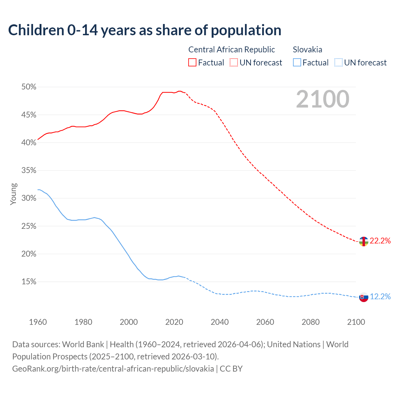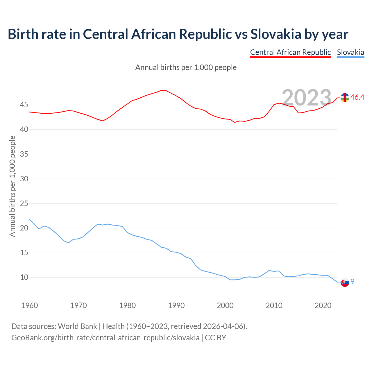 The Central African Republic has an annual birth rate of 46.4 births per 1,000 people, compared to 9 for Slovakia. The average number of children a woman is expected to have during her lifetime — the fertility rate, is 6.01 in the Central African Republic and 1.49 in Slovakia — 75.2% difference.