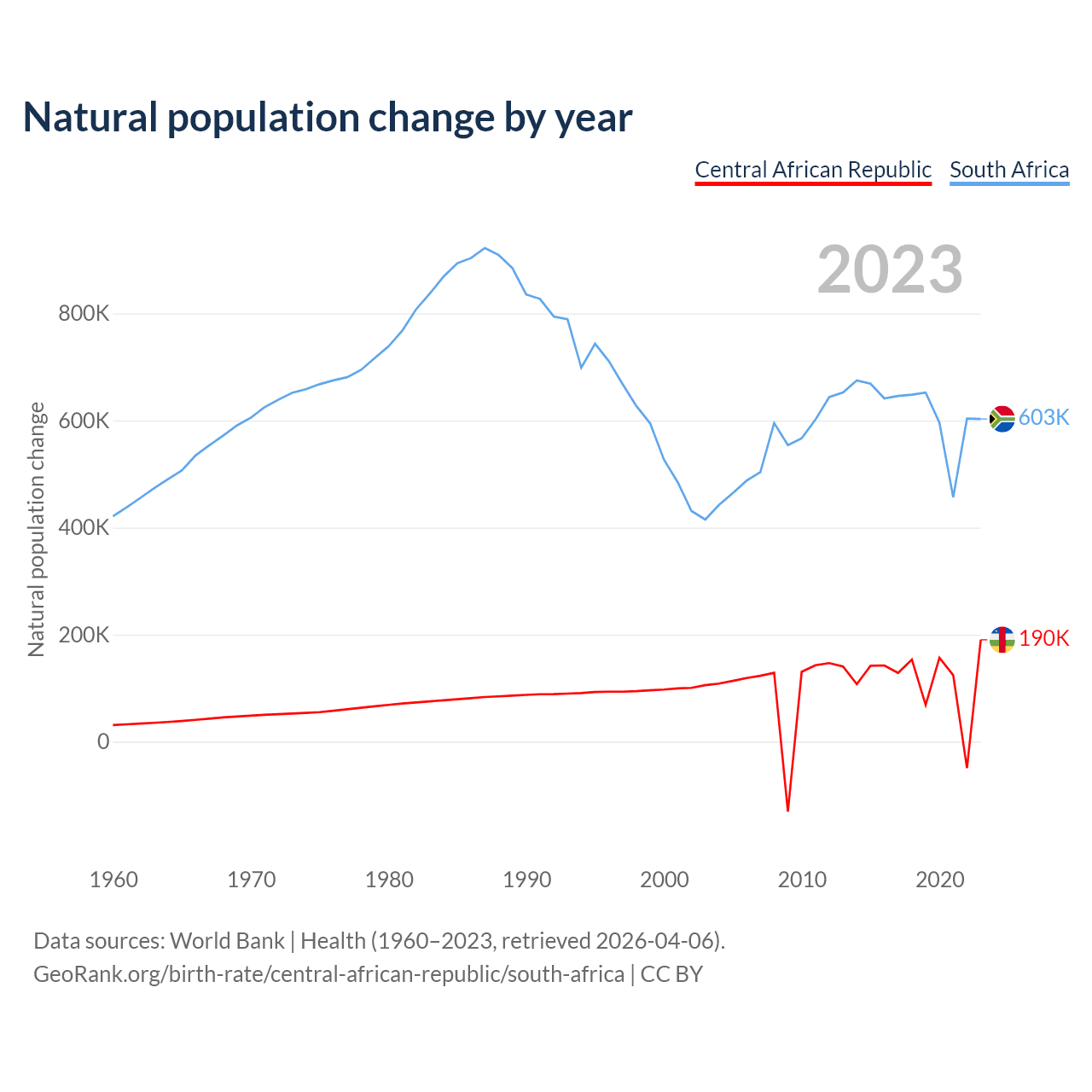 1960 vs 2023, the fertility rate has changed by +1.08% in the Central African Republic and by 63.7% in South Africa — in 1960, it was 5.95 and 6.11, respectively.