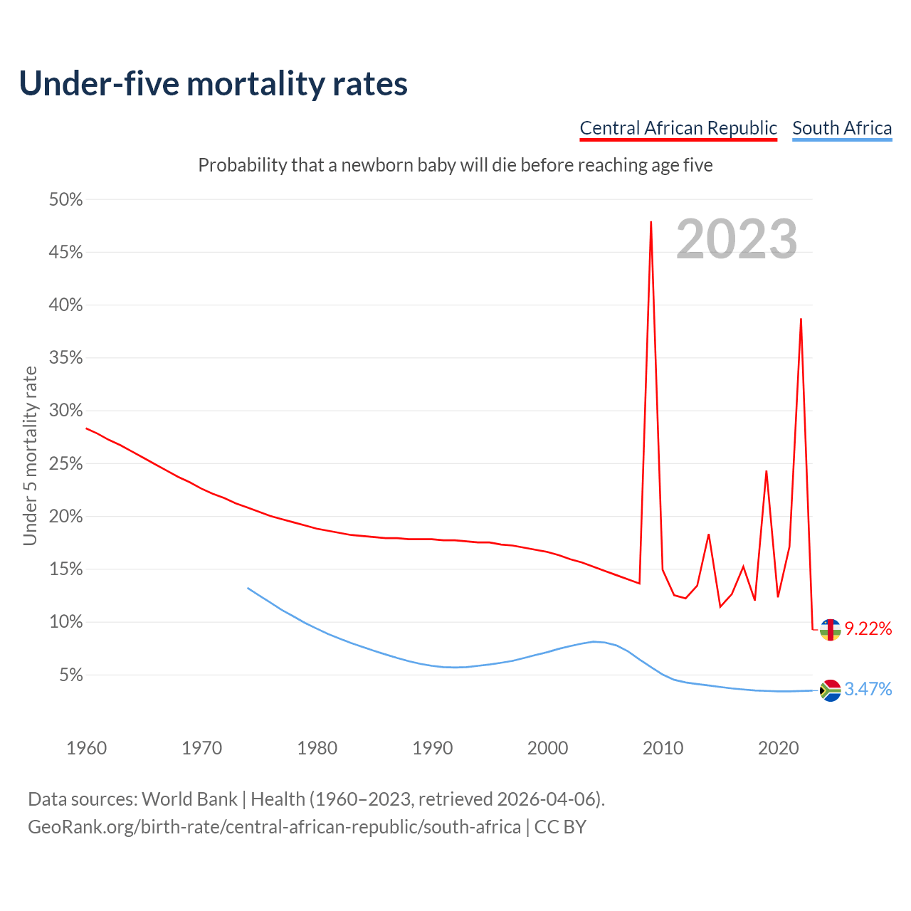 The chance that a newborn baby will die before reaching age five is 9.22% in the Central African Republic and 3.47% in South Africa. Above is a chart with historical data on under-five mortality rates.