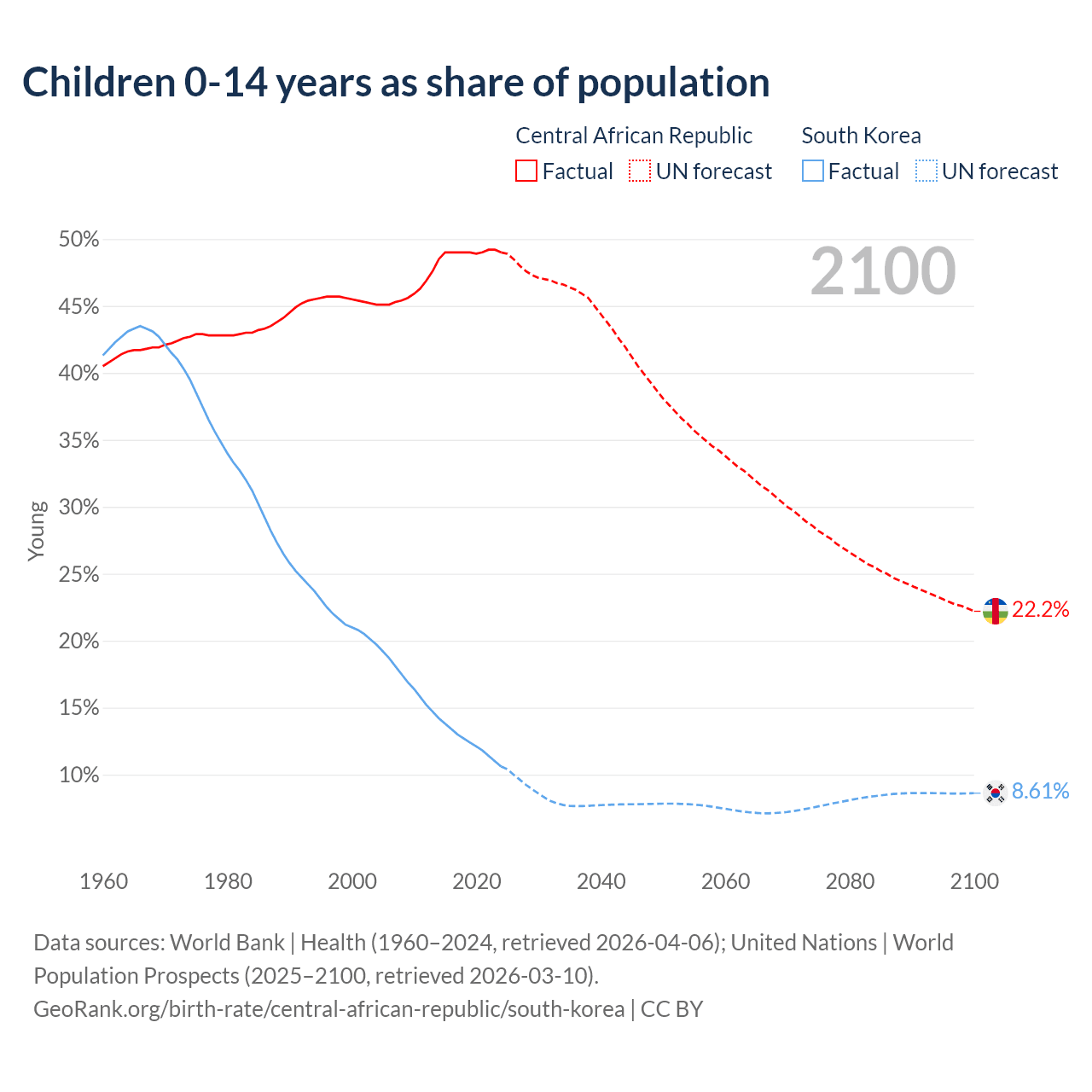 According to the latest available data on birth rates, the fertility rate in the Central African Republic was 6.01 children per woman in 2023, compared to 0.72 in South Korea in 2023. The replacement level is considered to be 2.1 children per woman.