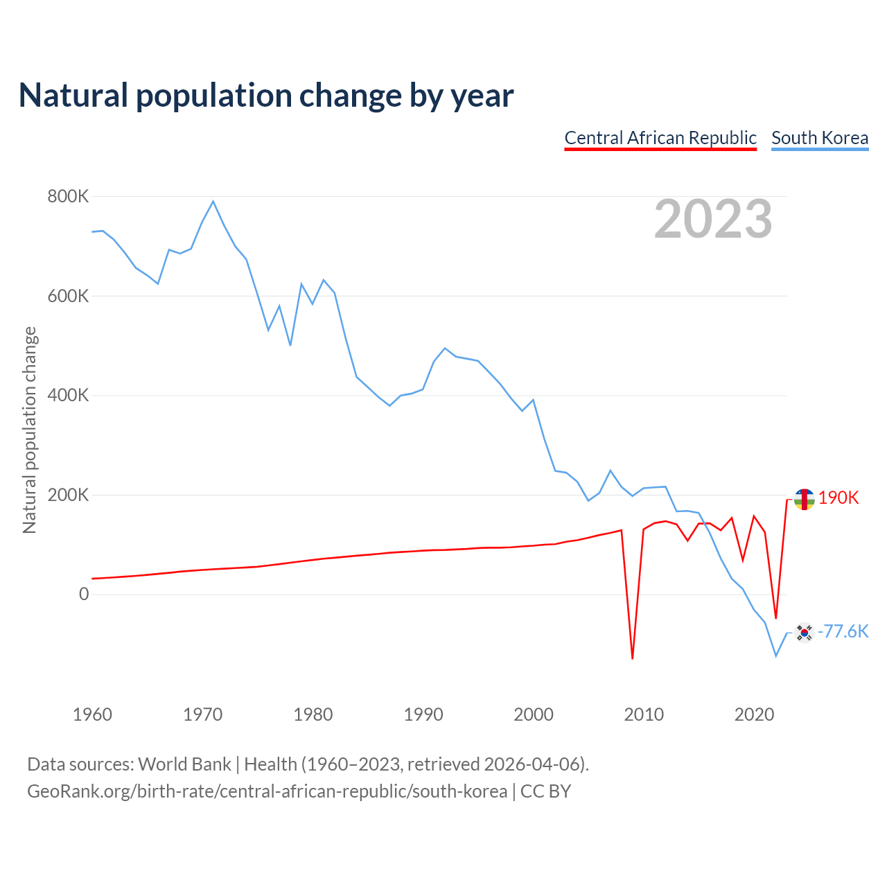 The Central African Republic has an annual birth rate of 46.4 births per 1,000 people, compared to 4.5 for South Korea. The average number of children a woman is expected to have during her lifetime — the fertility rate, is 6.01 in the Central African Republic and 0.72 in South Korea — 88% difference.