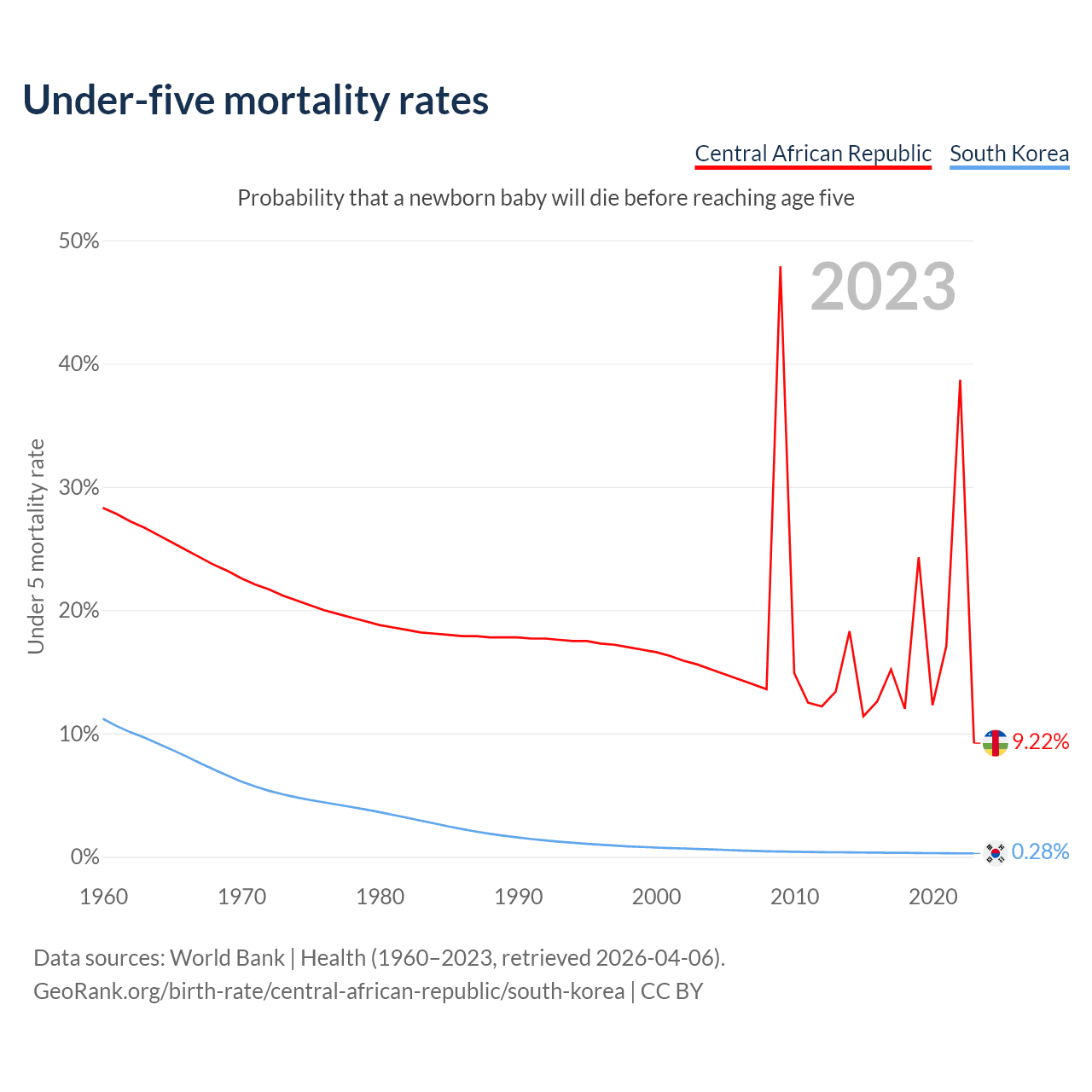 The chance that a newborn baby will die before reaching age five is 9.22% in the Central African Republic and 0.28% in South Korea. Above is a chart with historical data on under-five mortality rates.