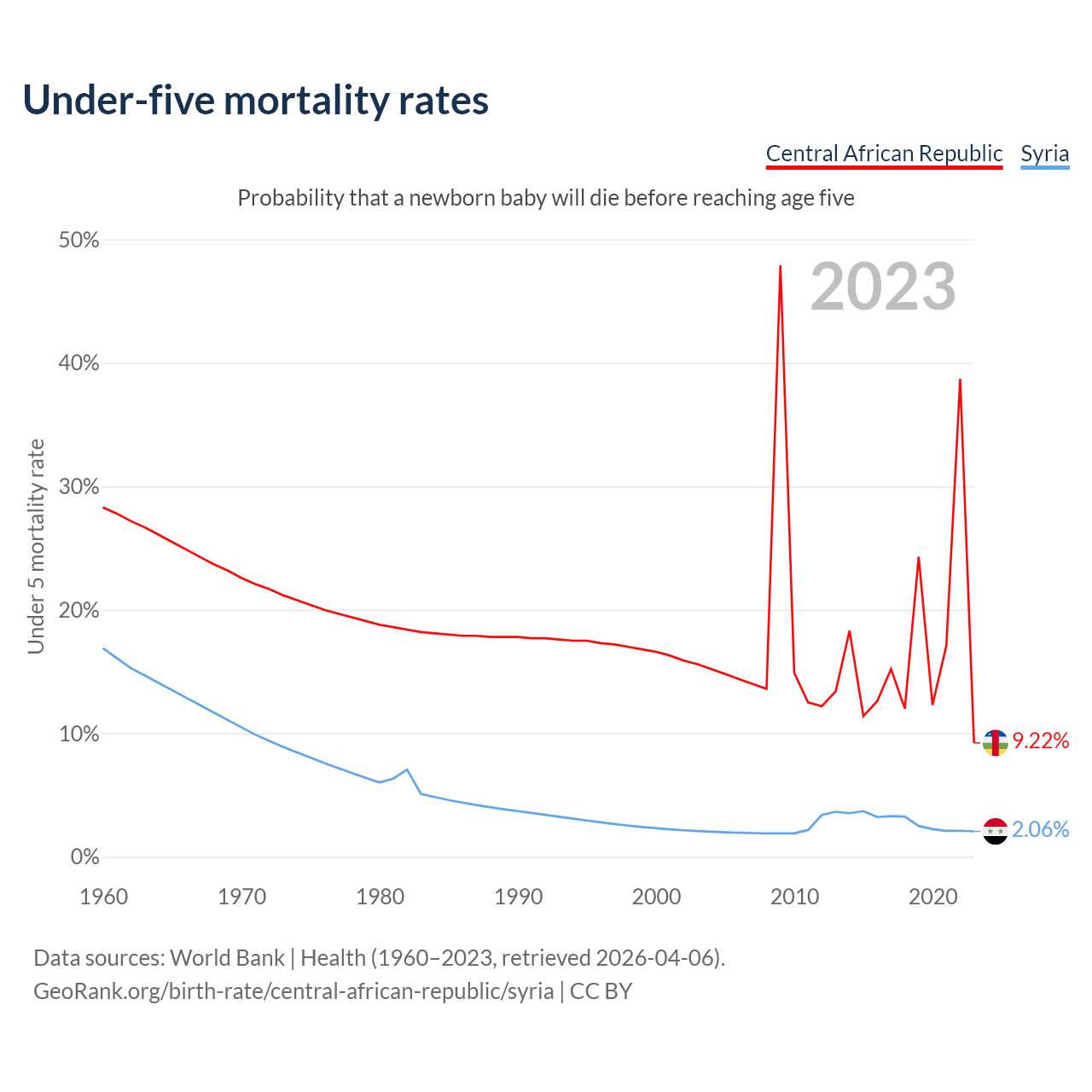 The chance that a newborn baby will die before reaching age five is 9.22% in the Central African Republic and 2.06% in Syria. Above is a chart with historical data on under-five mortality rates.