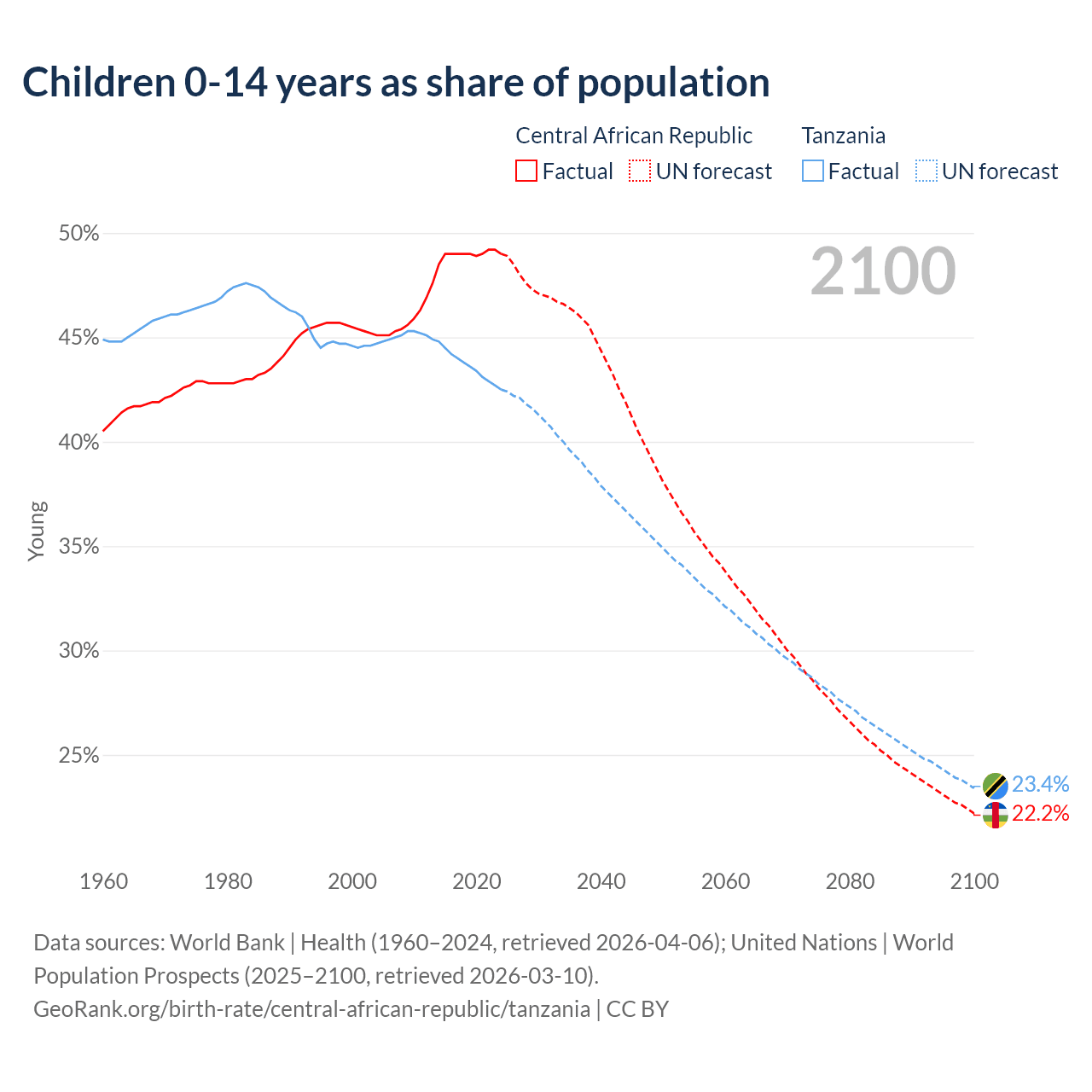 1960 vs 2023, the fertility rate has changed by +1.08% in the Central African Republic and by 29.5% in Tanzania — in 1960, it was 5.95 and 6.54, respectively.