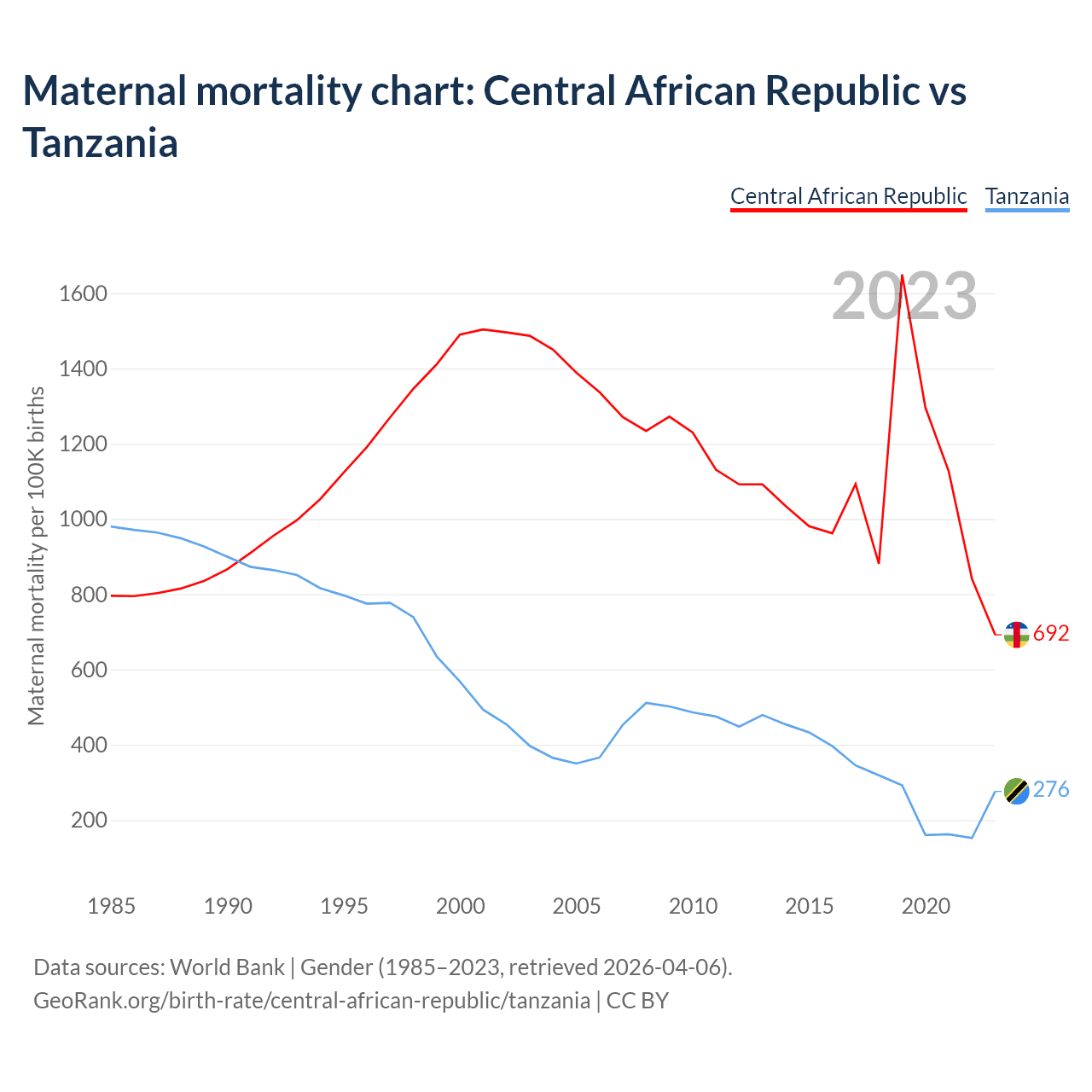The maternal mortality rate, which is the probability of dying during childbirth or within 42 days of pregnancy termination, is 692 deaths per 100,000 live births in the Central African Republic, compared to 276 deaths in Tanzania.