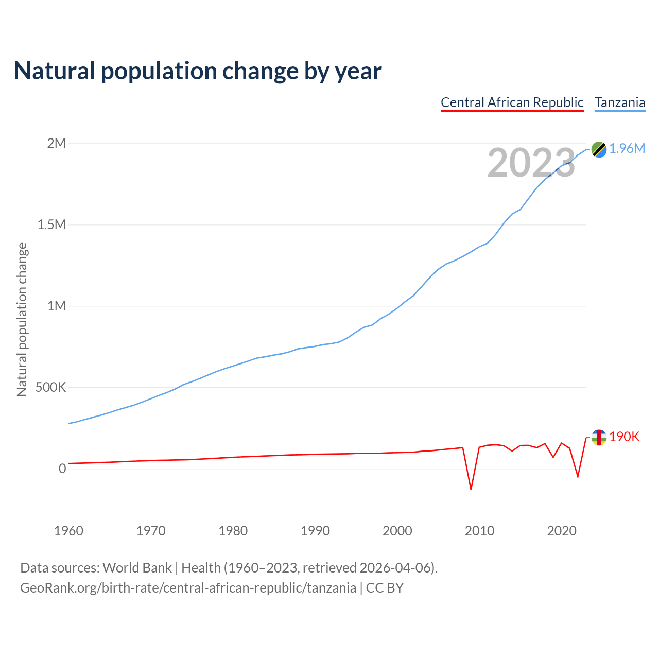 The Central African Republic has an annual birth rate of 46.4 births per 1,000 people, compared to 35.2 for Tanzania. The average number of children a woman is expected to have during her lifetime — the fertility rate, is 6.01 in the Central African Republic and 4.61 in Tanzania — 23.4% difference.