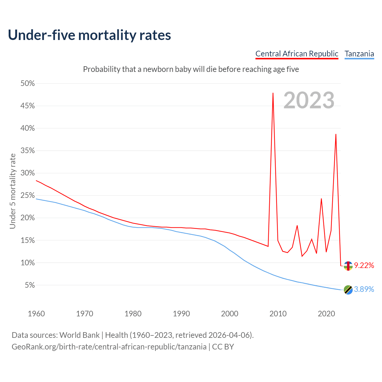 The chance that a newborn baby will die before reaching age five is 9.22% in the Central African Republic and 3.89% in Tanzania. Above is a chart with historical data on under-five mortality rates.