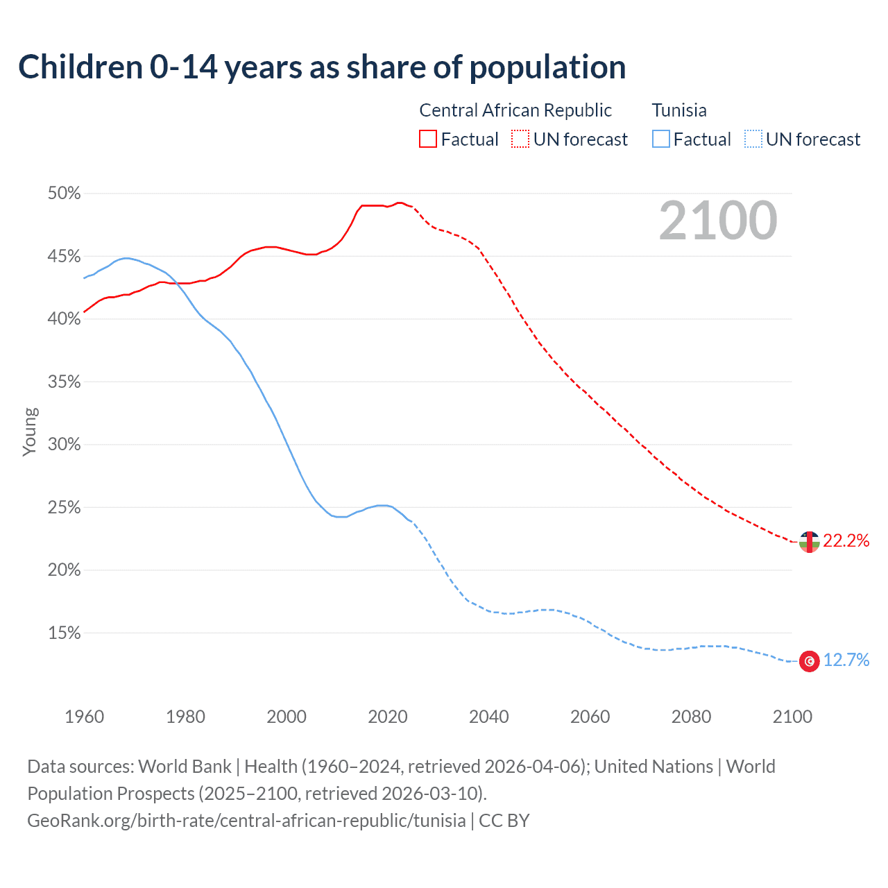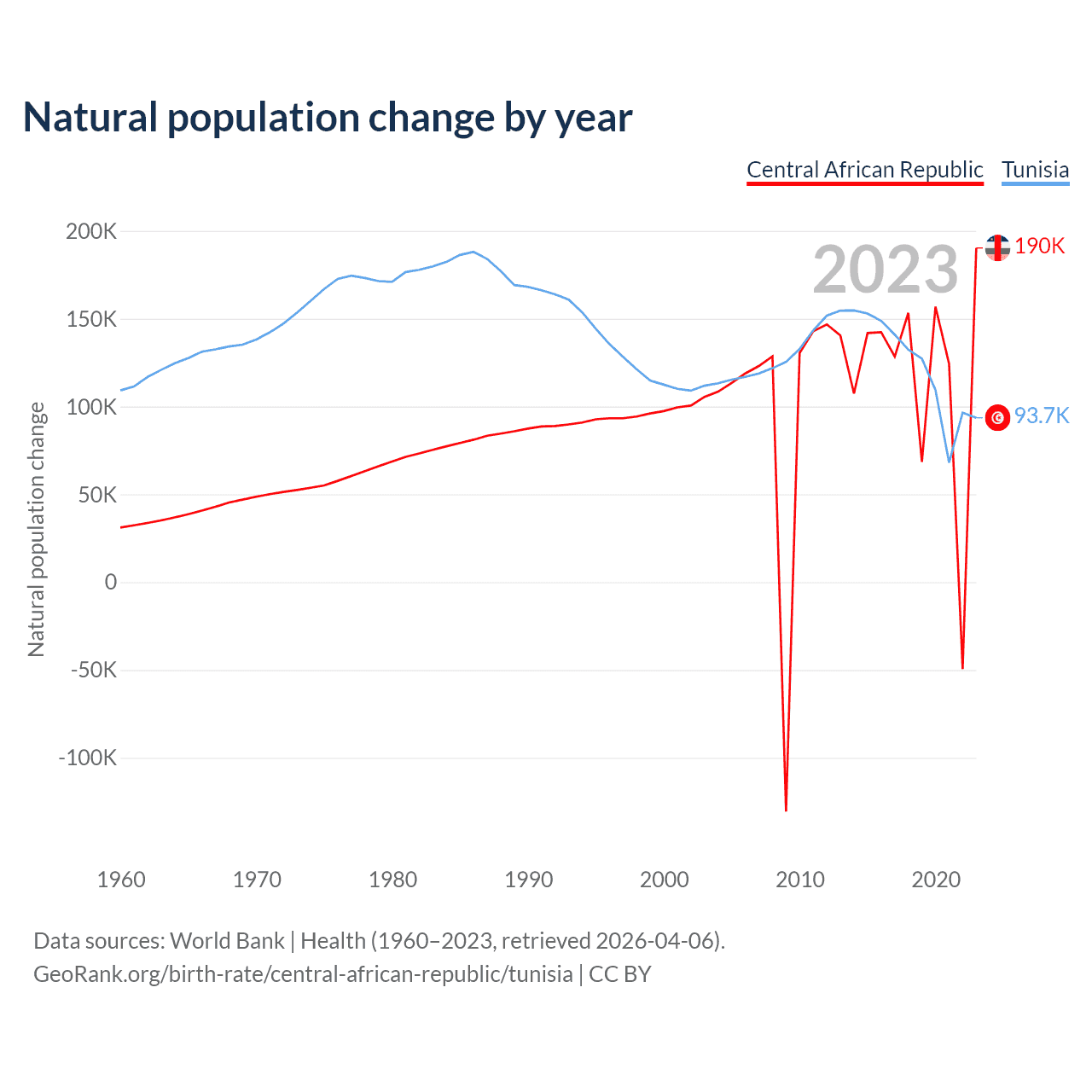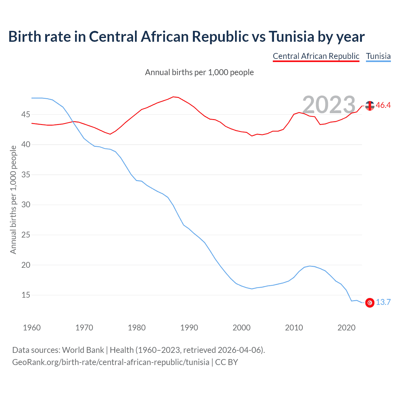 The Central African Republic has an annual birth rate of 46.4 births per 1,000 people, compared to 13.7 for Tunisia. The average number of children a woman is expected to have during her lifetime — the fertility rate, is 6.01 in the Central African Republic and 1.83 in Tunisia — 69.5% difference.