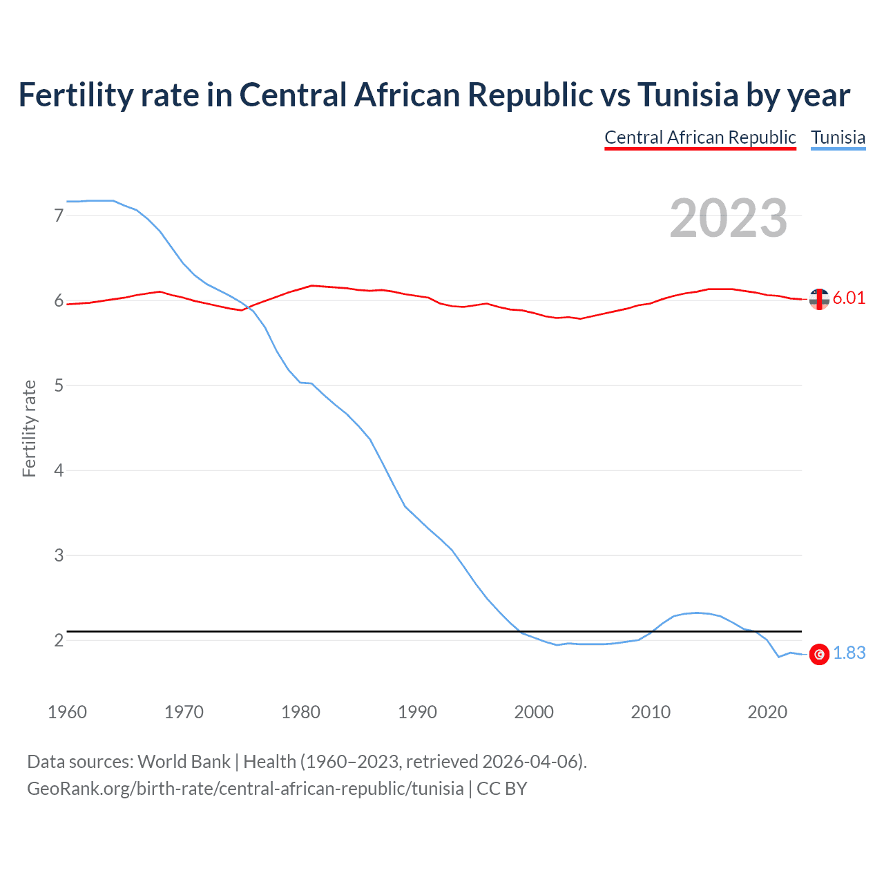 According to the latest available data on birth rates, the fertility rate in the Central African Republic was 6.01 children per woman in 2023, compared to 1.83 in Tunisia in 2023. The replacement level is considered to be 2.1 children per woman.