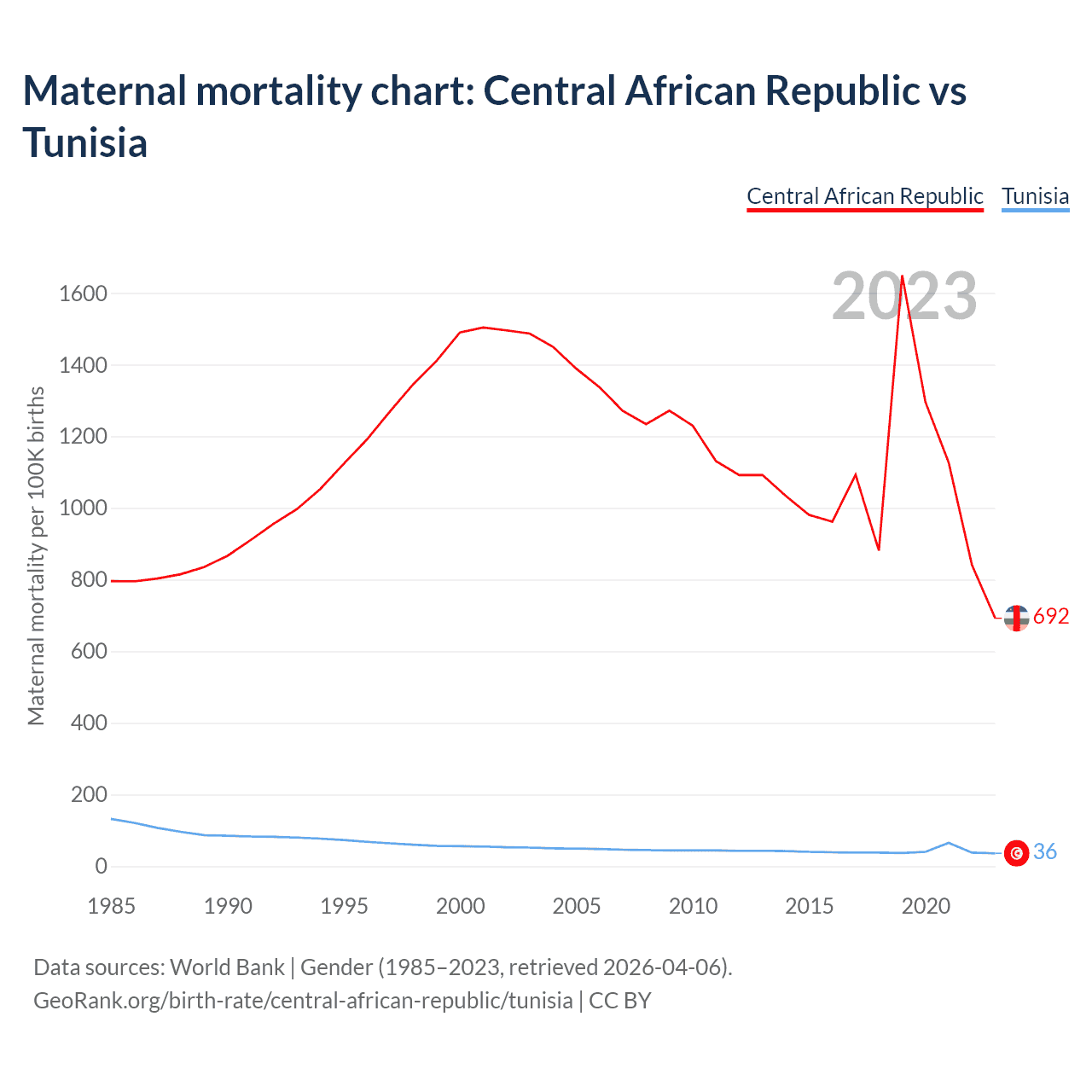 The maternal mortality rate, which is the probability of dying during childbirth or within 42 days of pregnancy termination, is 692 deaths per 100,000 live births in the Central African Republic, compared to 36 deaths in Tunisia.